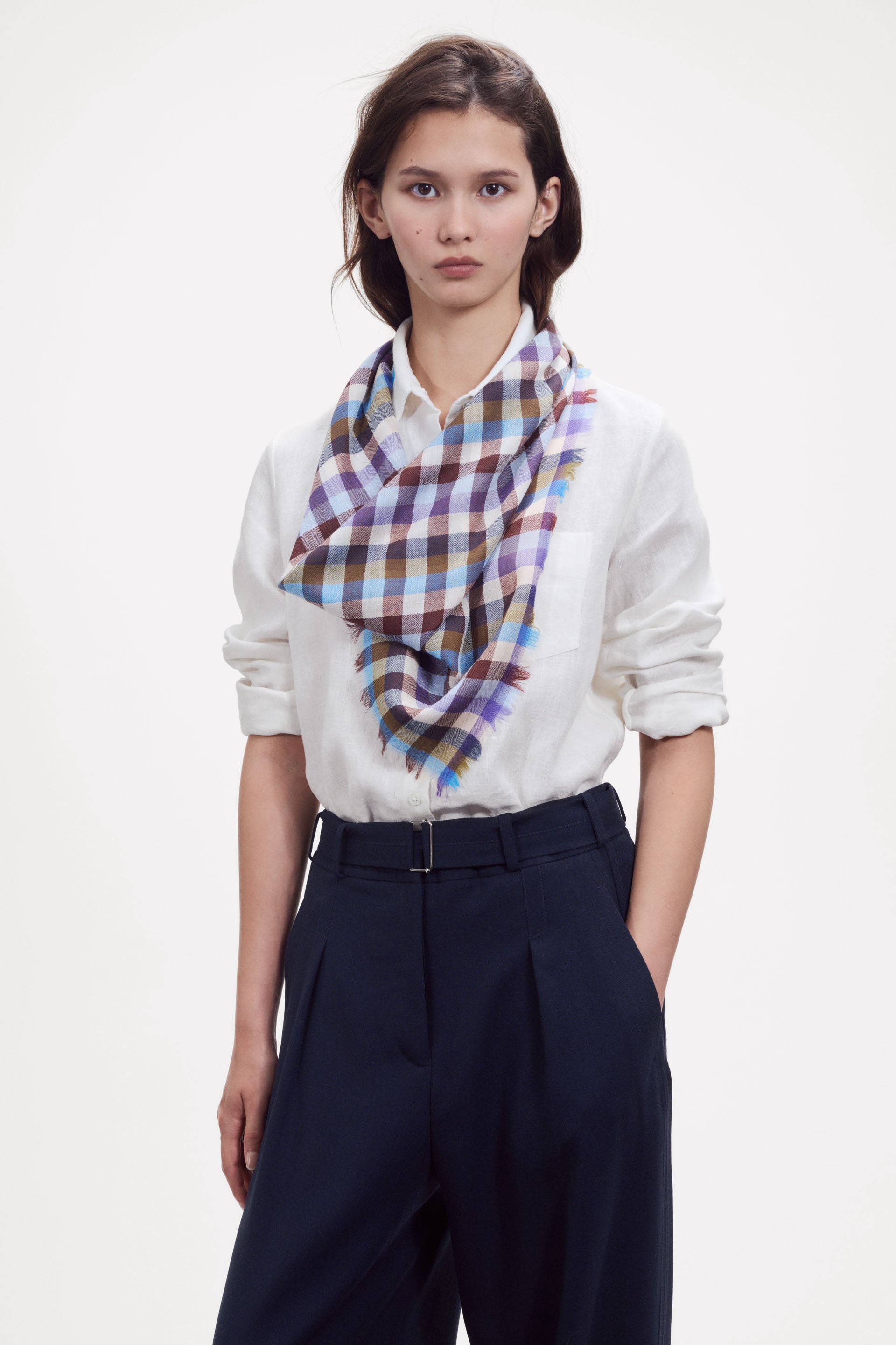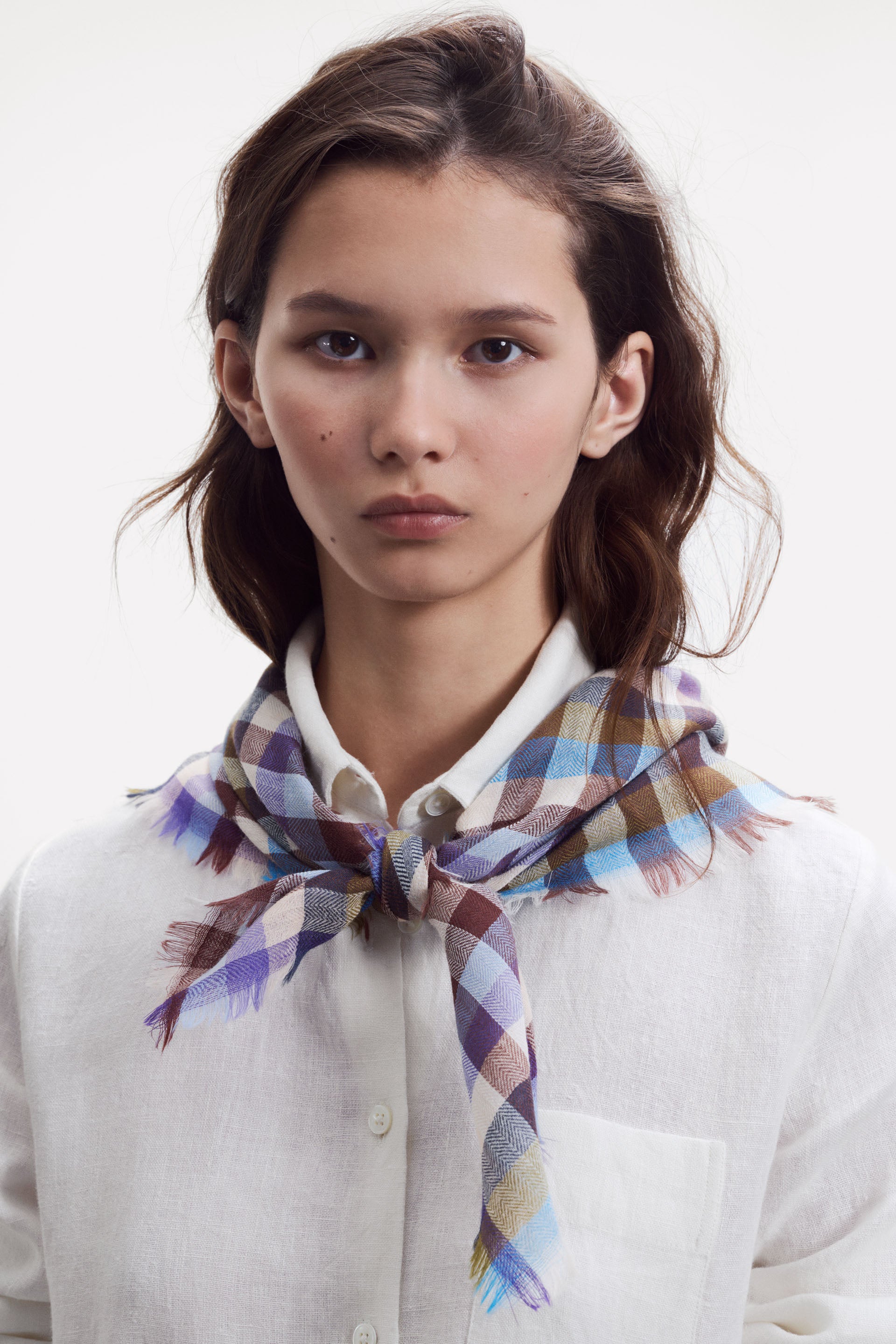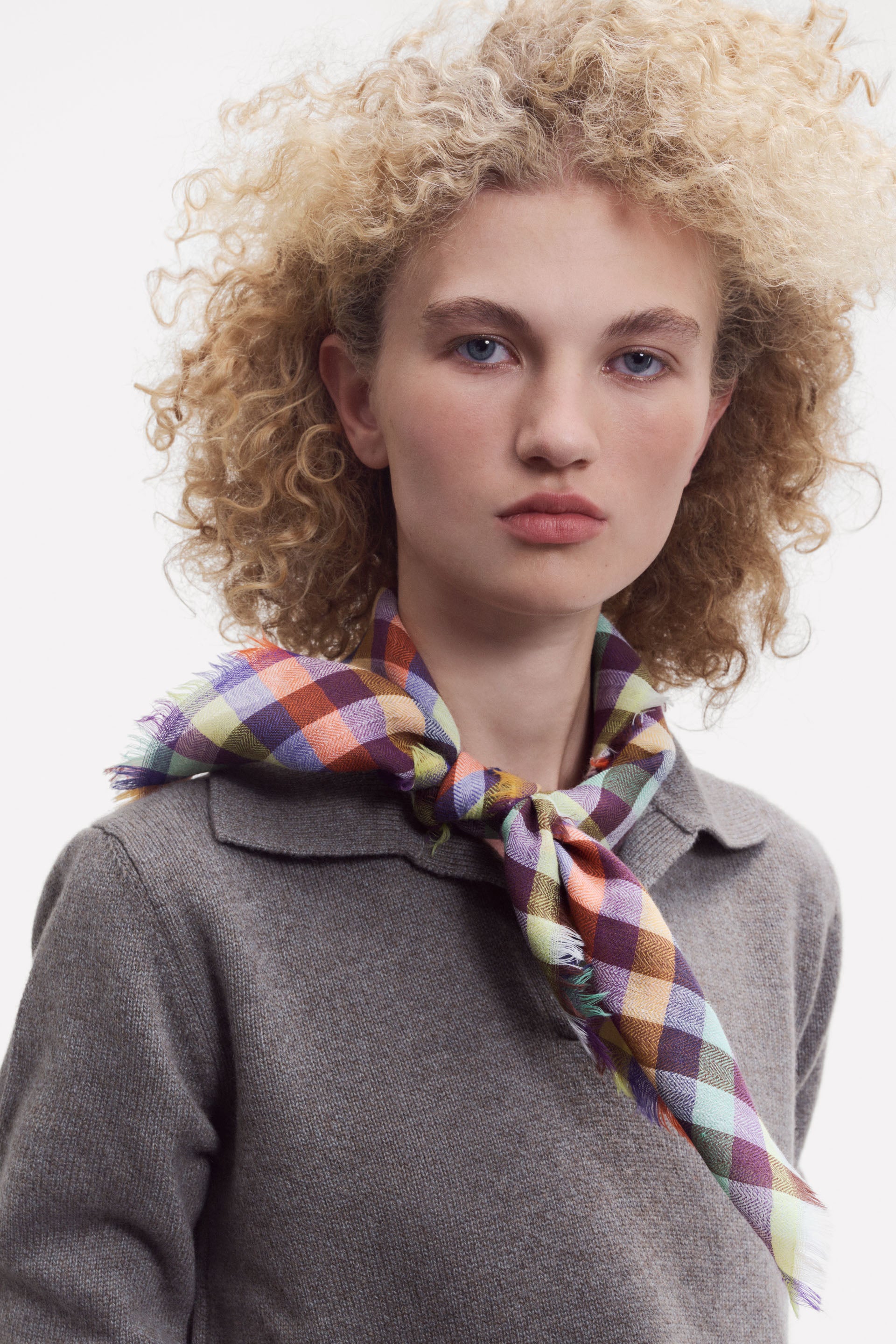 Large square scarf, woven in a soft, herringbone weave. A basic wardrobe staple, it embodies the spirit of Maison Epice with its airy wool fabric, vivid color combinations and our iconic yarn-dyed check pattern, a lasting source of bold chromatic exploration, season after season. Finished with delicate fringed edges.
