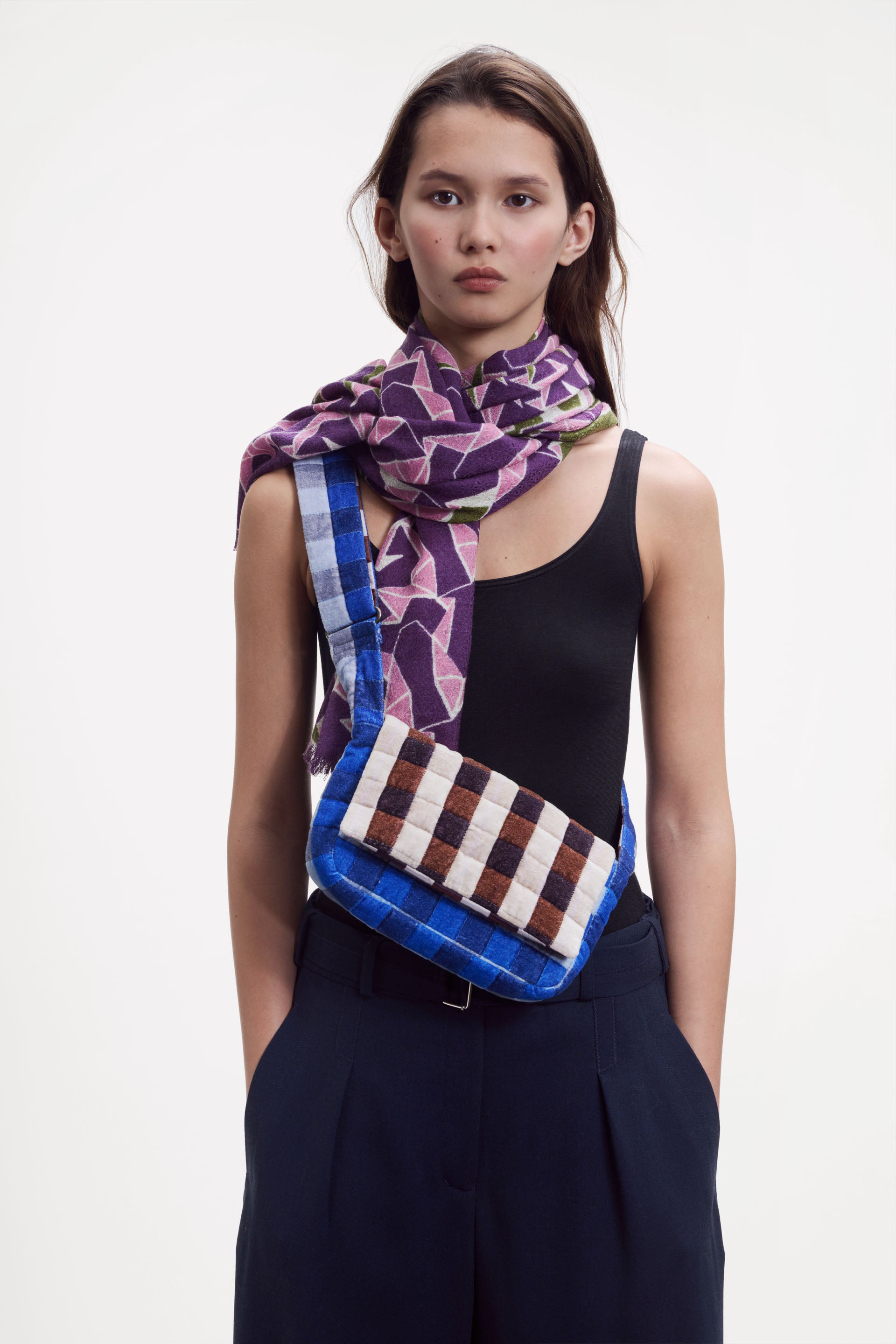 Compact and stylish crossbody bag with a flap closure, in quilted cotton velvet. Polyester lining matching the main design. Wide, adjustable velvet shoulder strap with a polyester underside. Zipper with velvet pull tab. This small, practical bag featuring our Check pattern, is the perfect everyday companion and a fun addition to our totes and stoles.