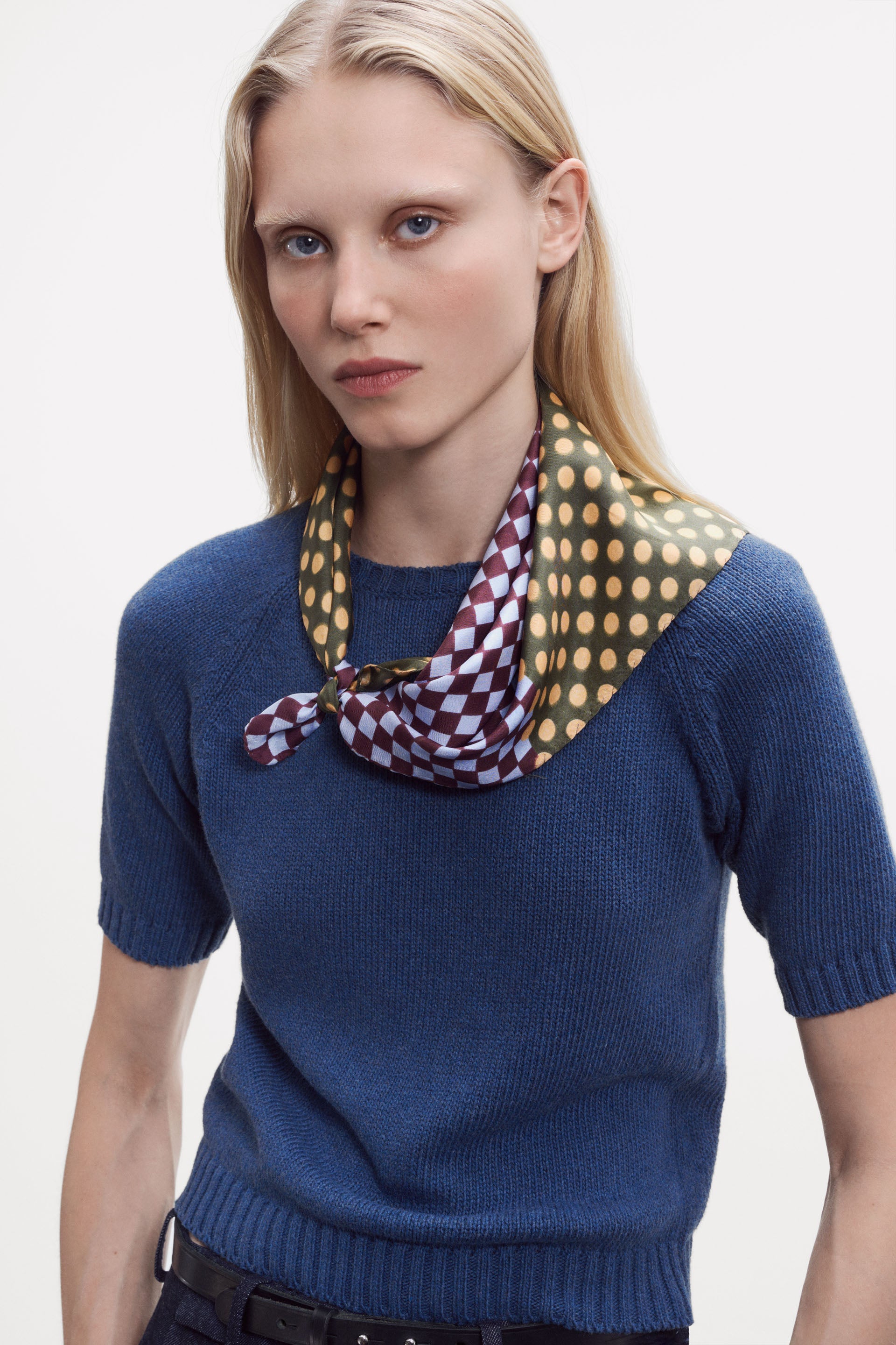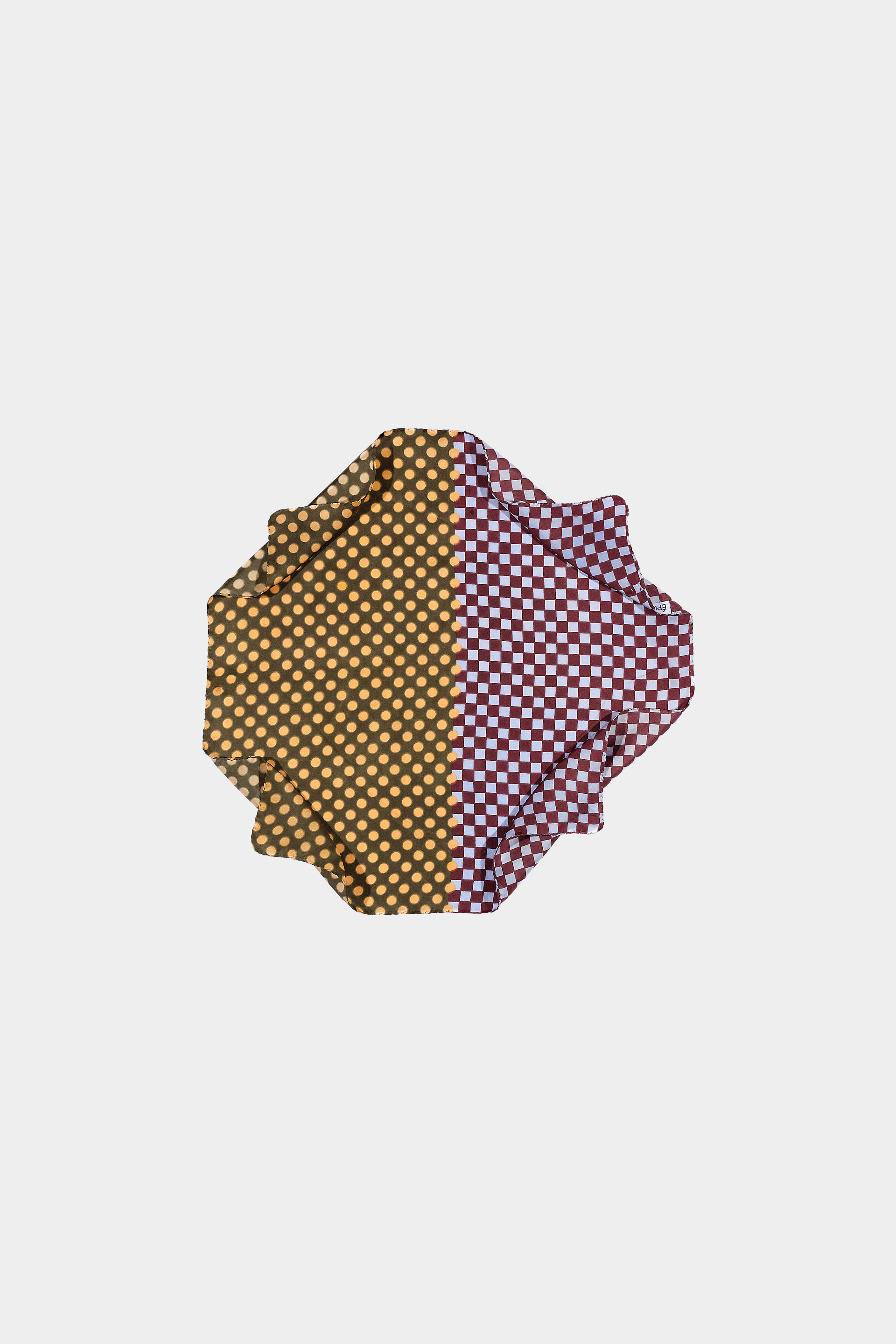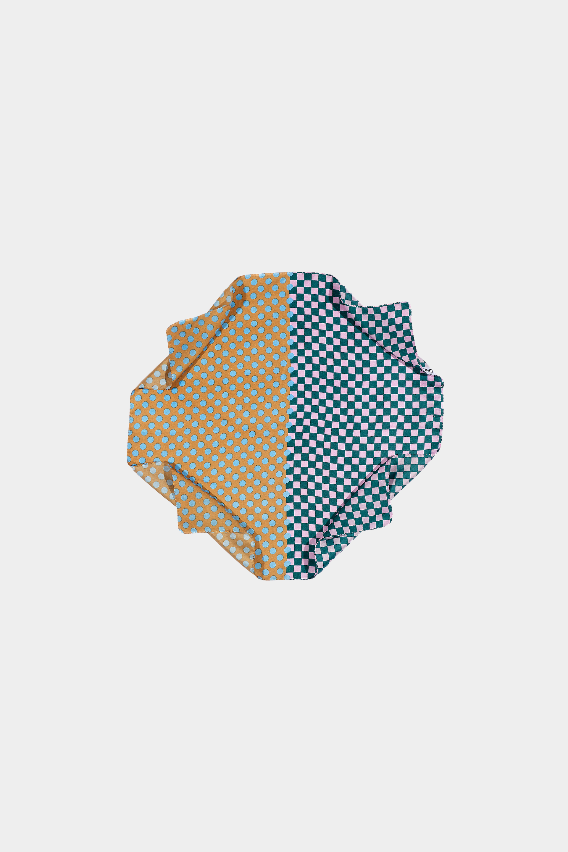 Small square scarf in pure silk with a color blocking style. An elegant, new Graphic pattern combining small checks and dots, elevated by bold, vibrant color combinations. The interplay of hues is fully revealed when tied or styled. Finished with an elegant hand stitched rolled hem. Adapted from our GW 2540 wool square scarves. Digitally printed. Made in Lyon, France.