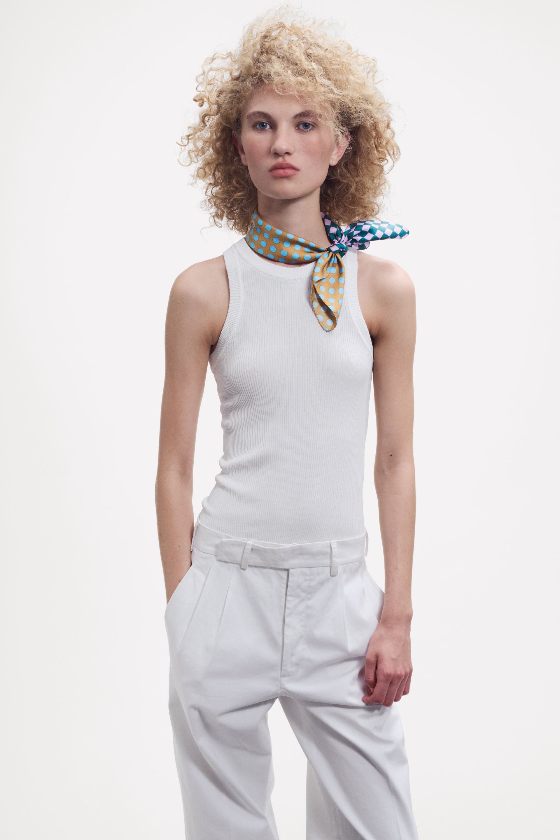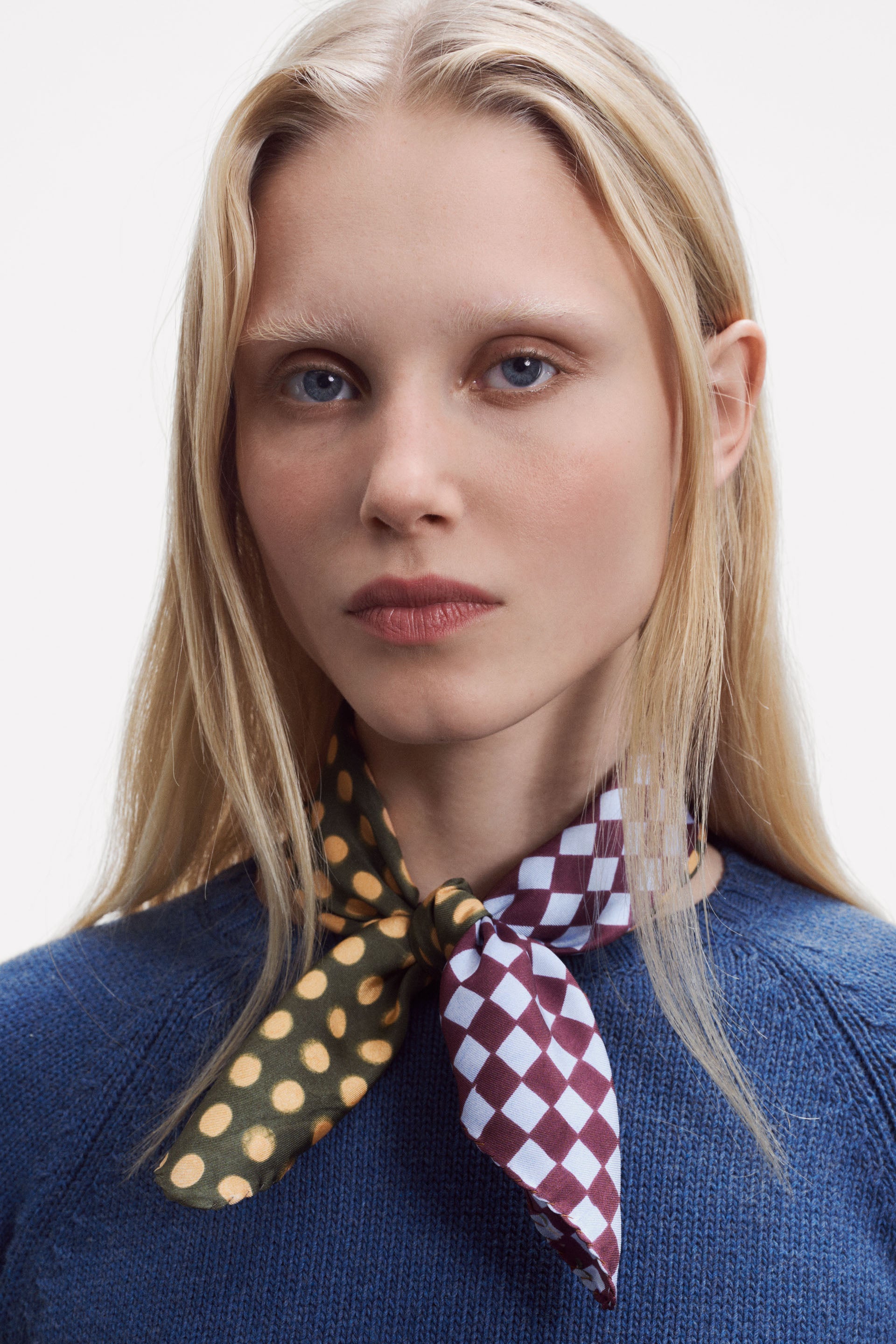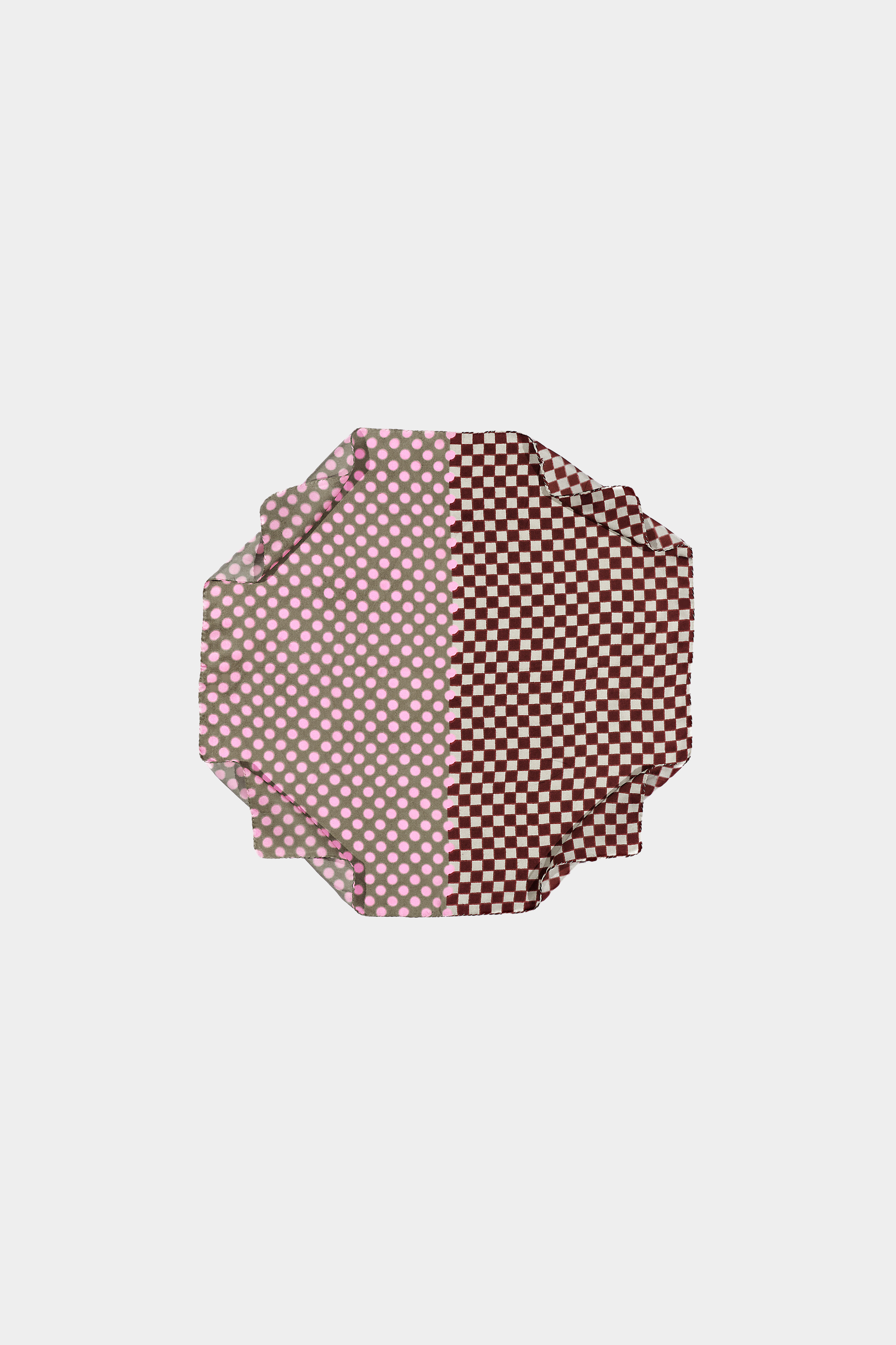 Small square scarf in pure silk with a color blocking style. An elegant, new Graphic pattern combining small checks and dots, elevated by bold, vibrant color combinations. The interplay of hues is fully revealed when tied or styled. Finished with an elegant hand stitched rolled hem. Adapted from our GW 2540 wool square scarves. Digitally printed. Made in Lyon, France.