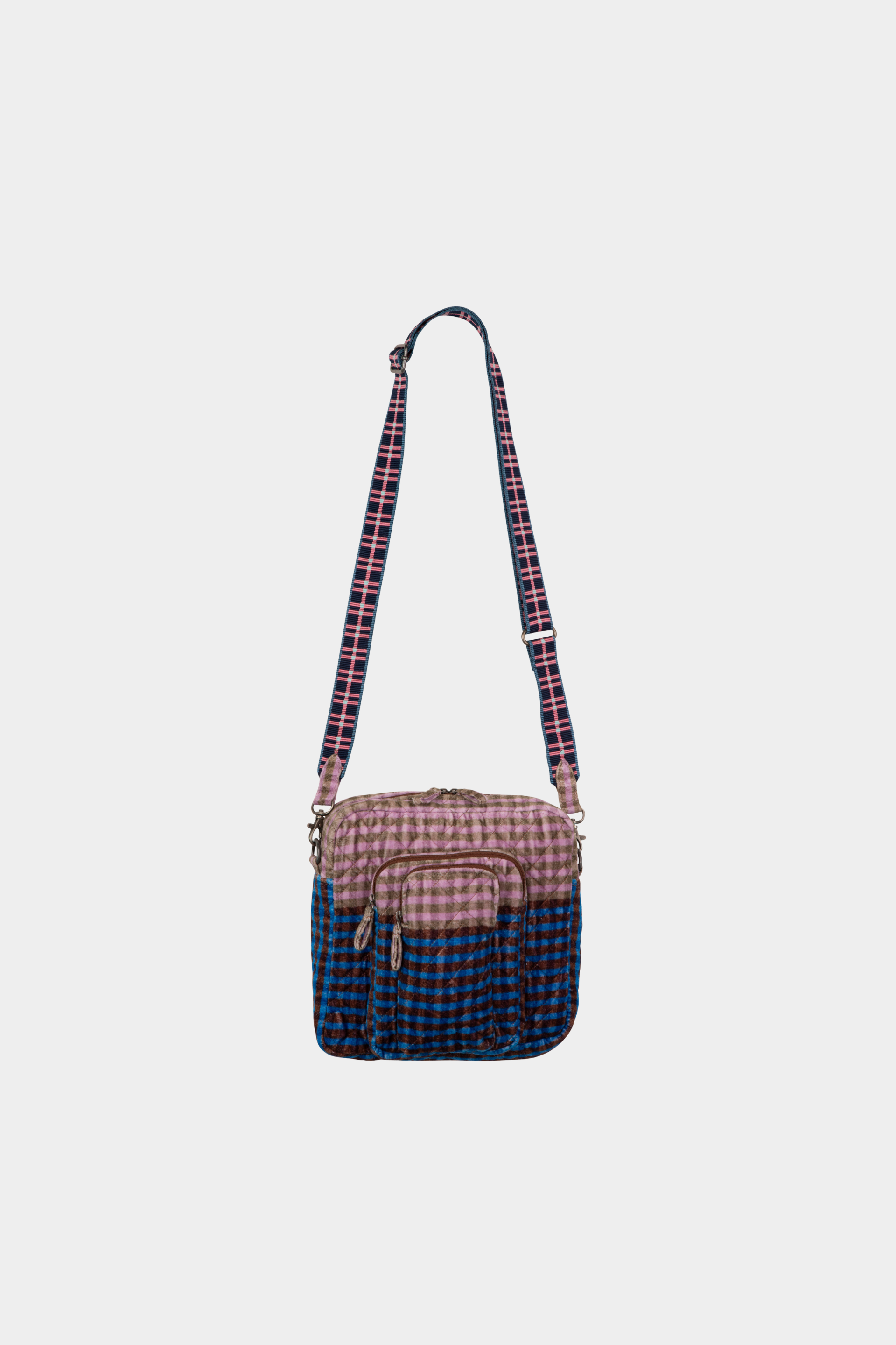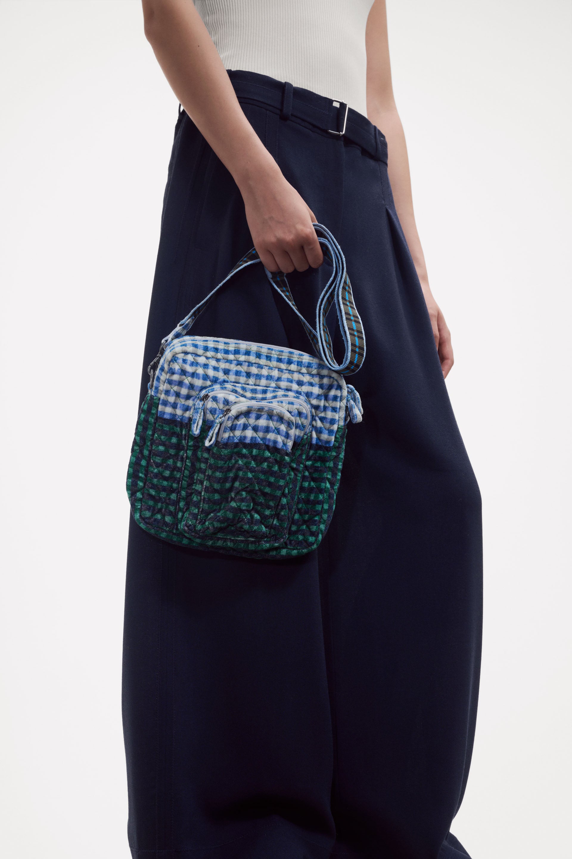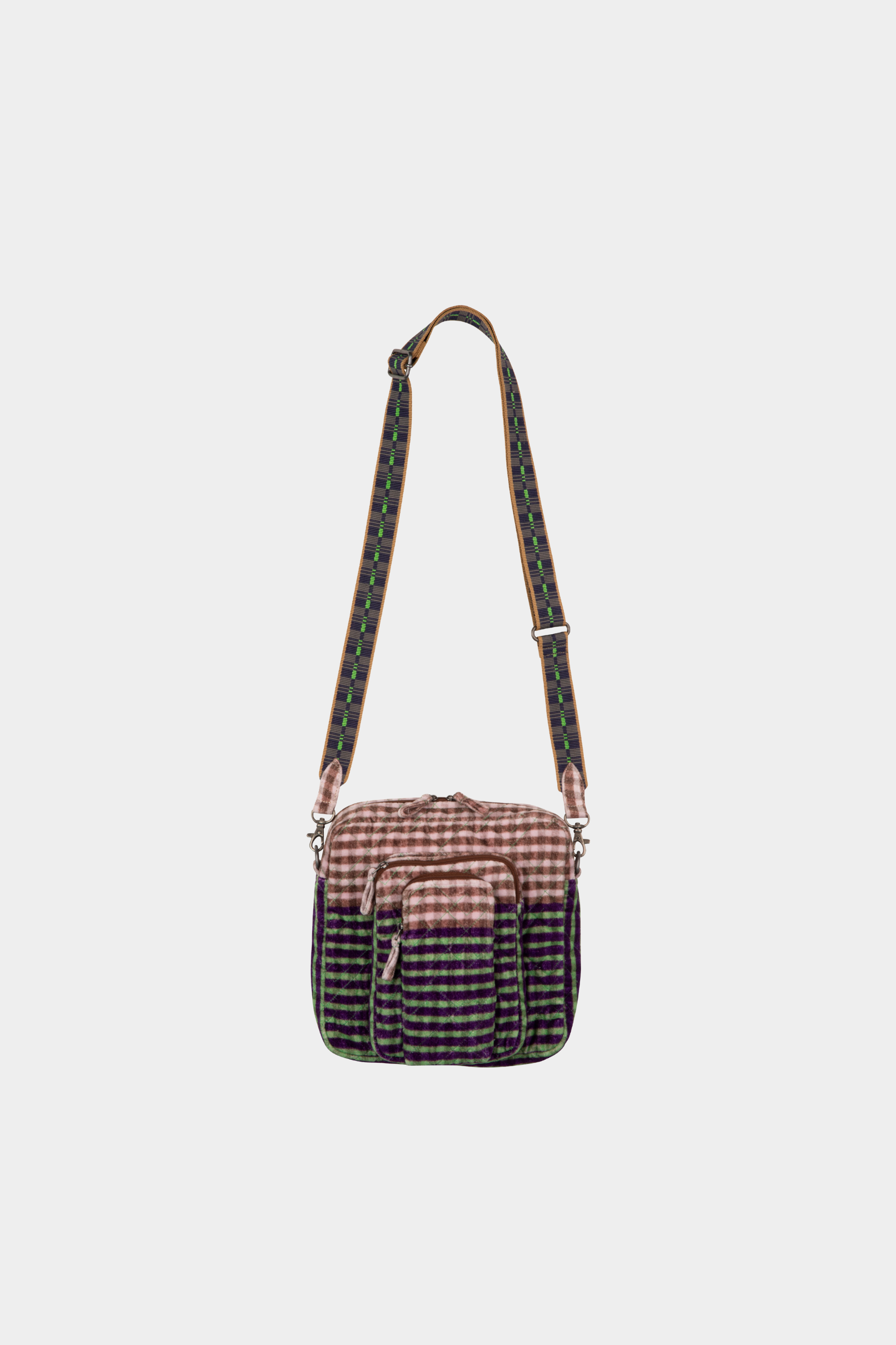 Small, quilted crossbody bag in soft cotton velvet. Printed polyester lining matching the main design. The small Checks pattern borrowed from our stoles SW 2522, is, reinterpreted in vibrant color combinations. Adjustable and removable woven shoulder strap matching the bag. Velvet zipper pulls add a fun, stylish touch. Elegant and practical, with front zippered pouch pockets designed to hold all your essentials. A smart and chic addition to our stoles.