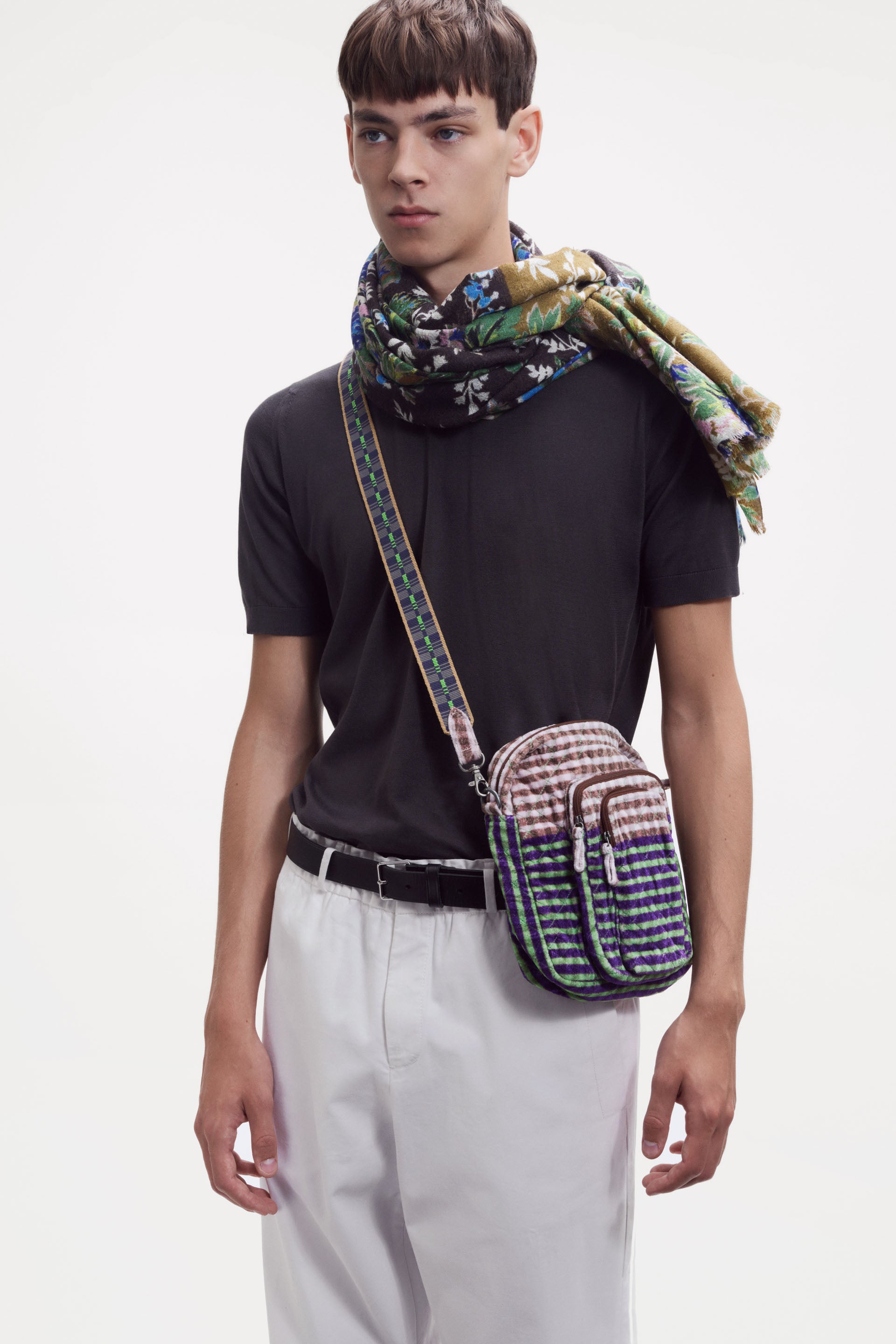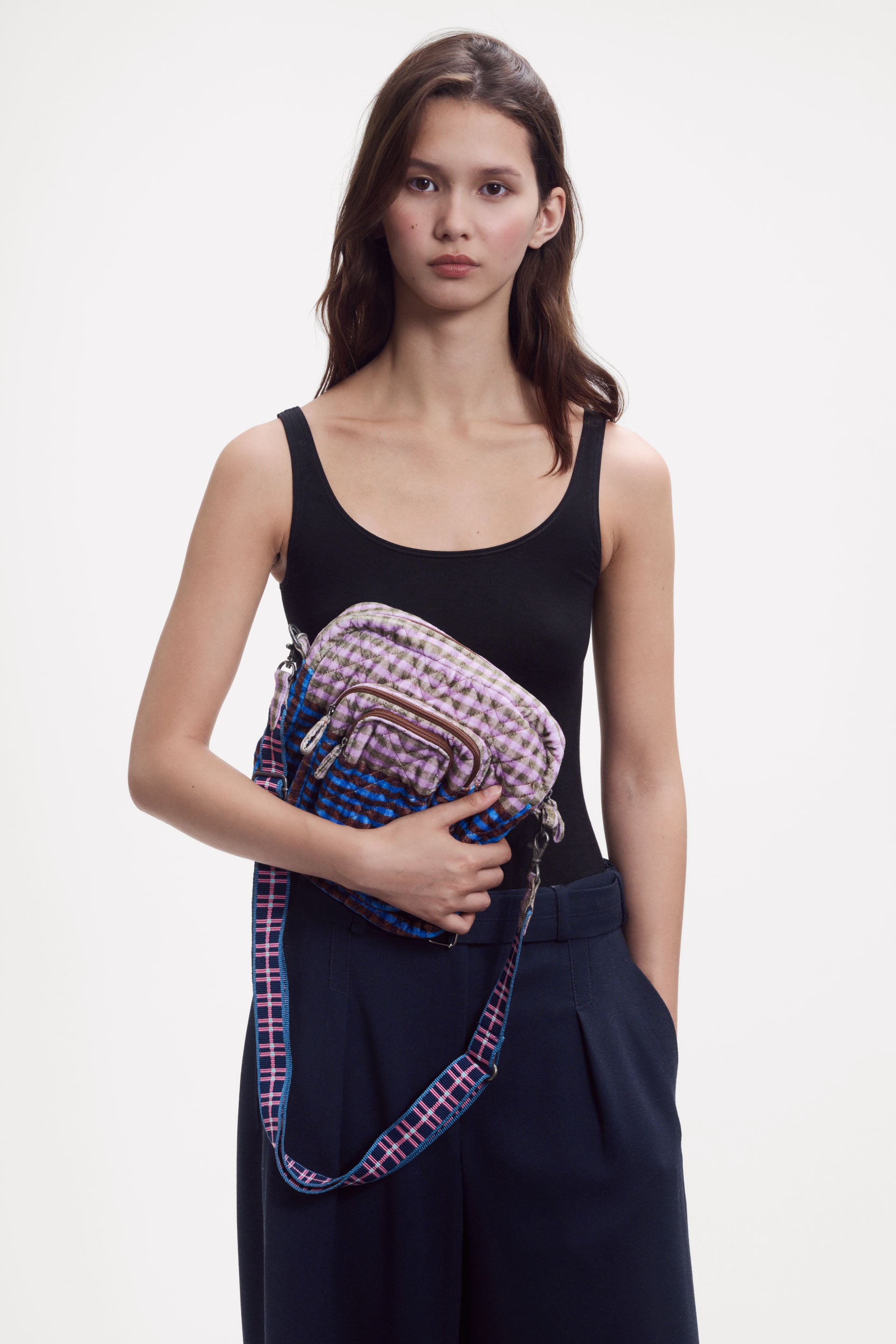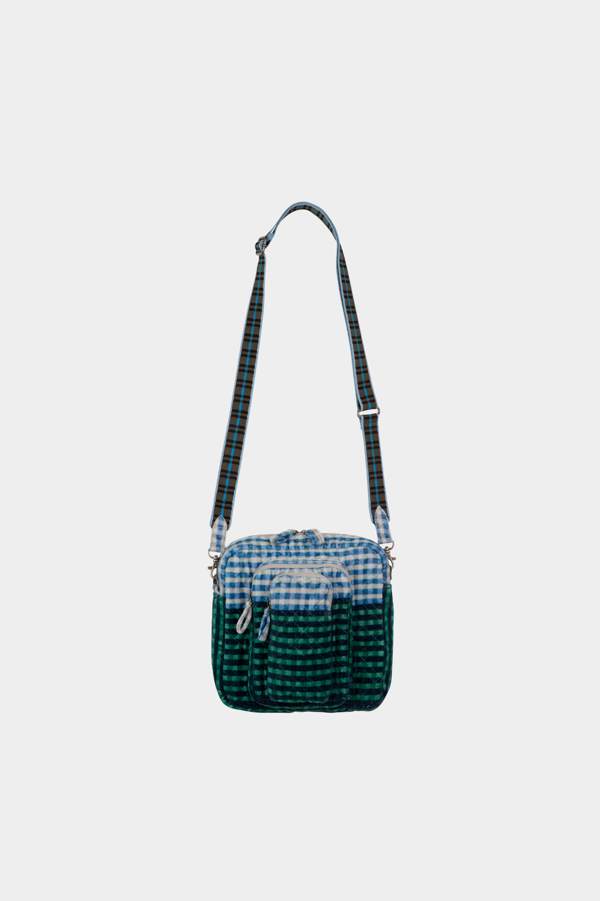 Small, quilted crossbody bag in soft cotton velvet. Printed polyester lining matching the main design. The small Checks pattern borrowed from our stoles SW 2522, is, reinterpreted in vibrant color combinations. Adjustable and removable woven shoulder strap matching the bag. Velvet zipper pulls add a fun, stylish touch. Elegant and practical, with front zippered pouch pockets designed to hold all your essentials. A smart and chic addition to our stoles.