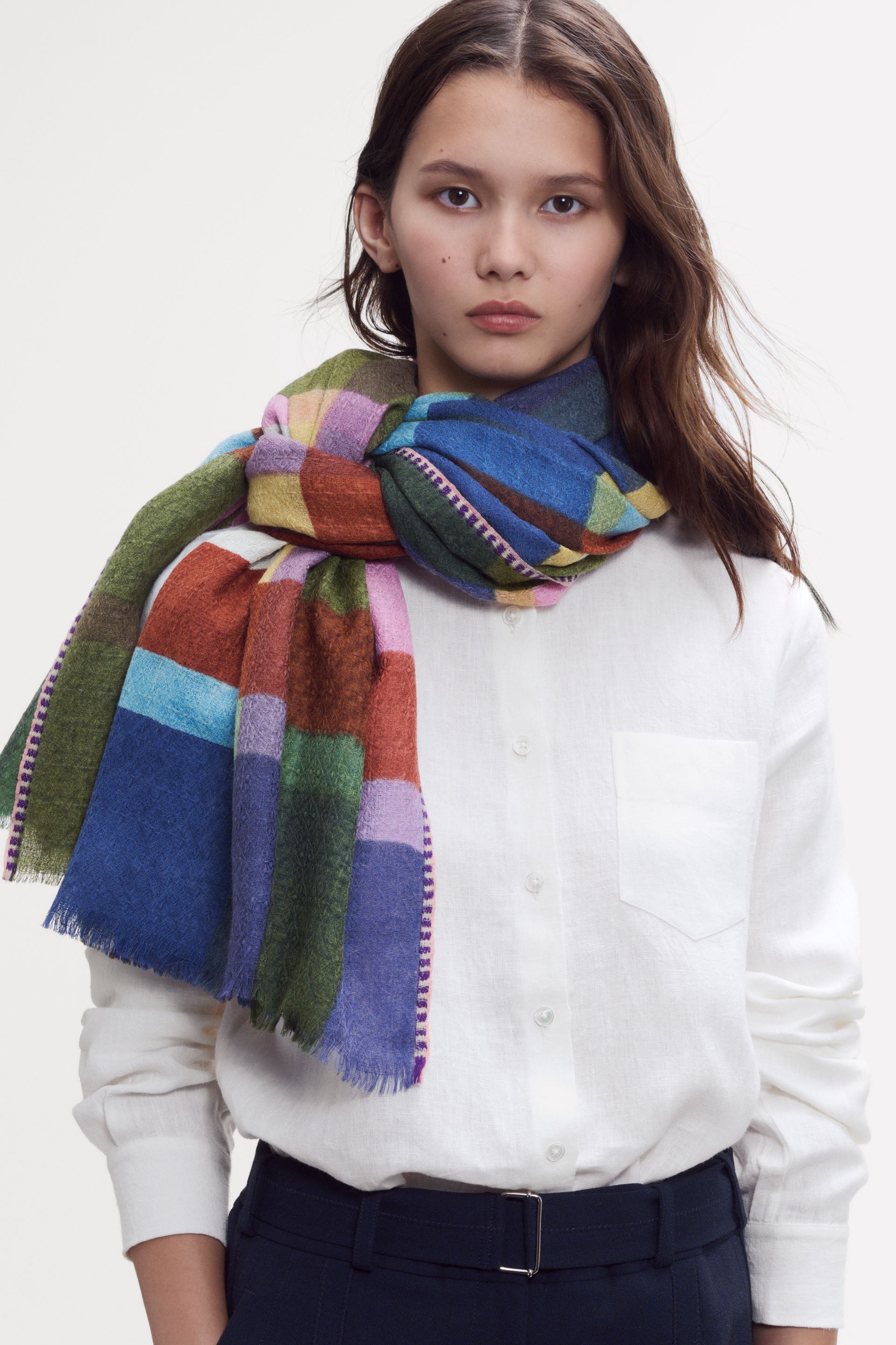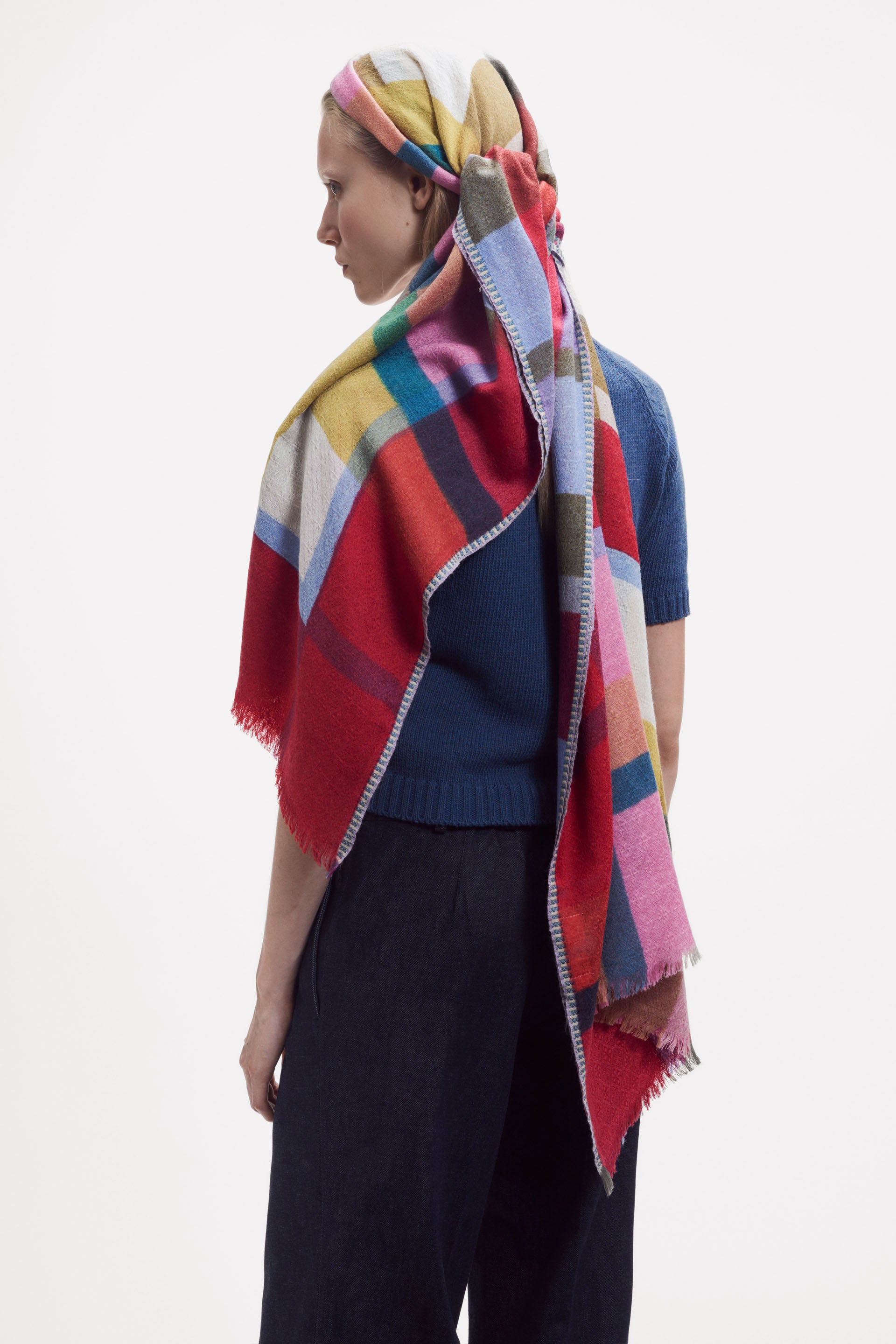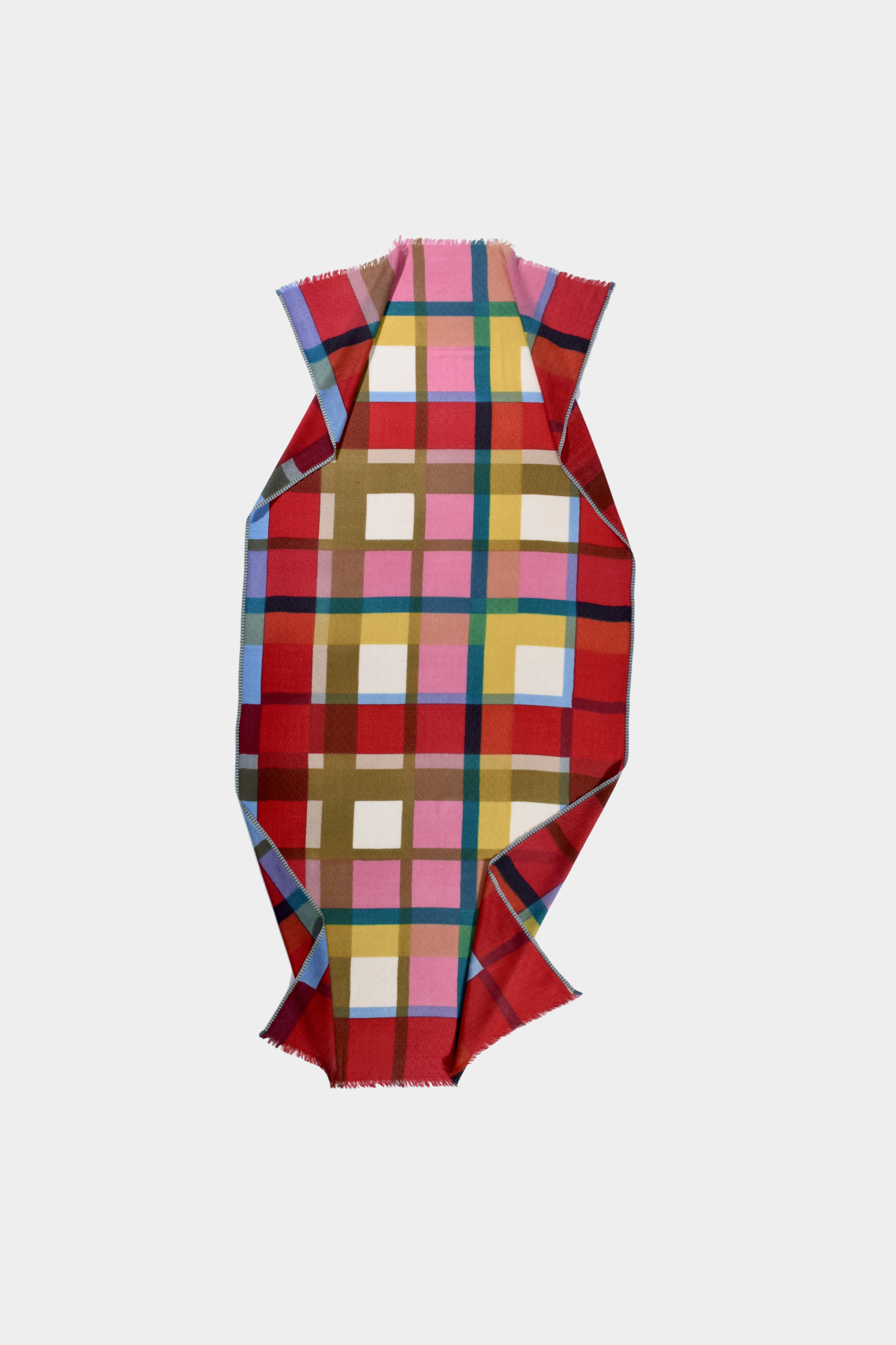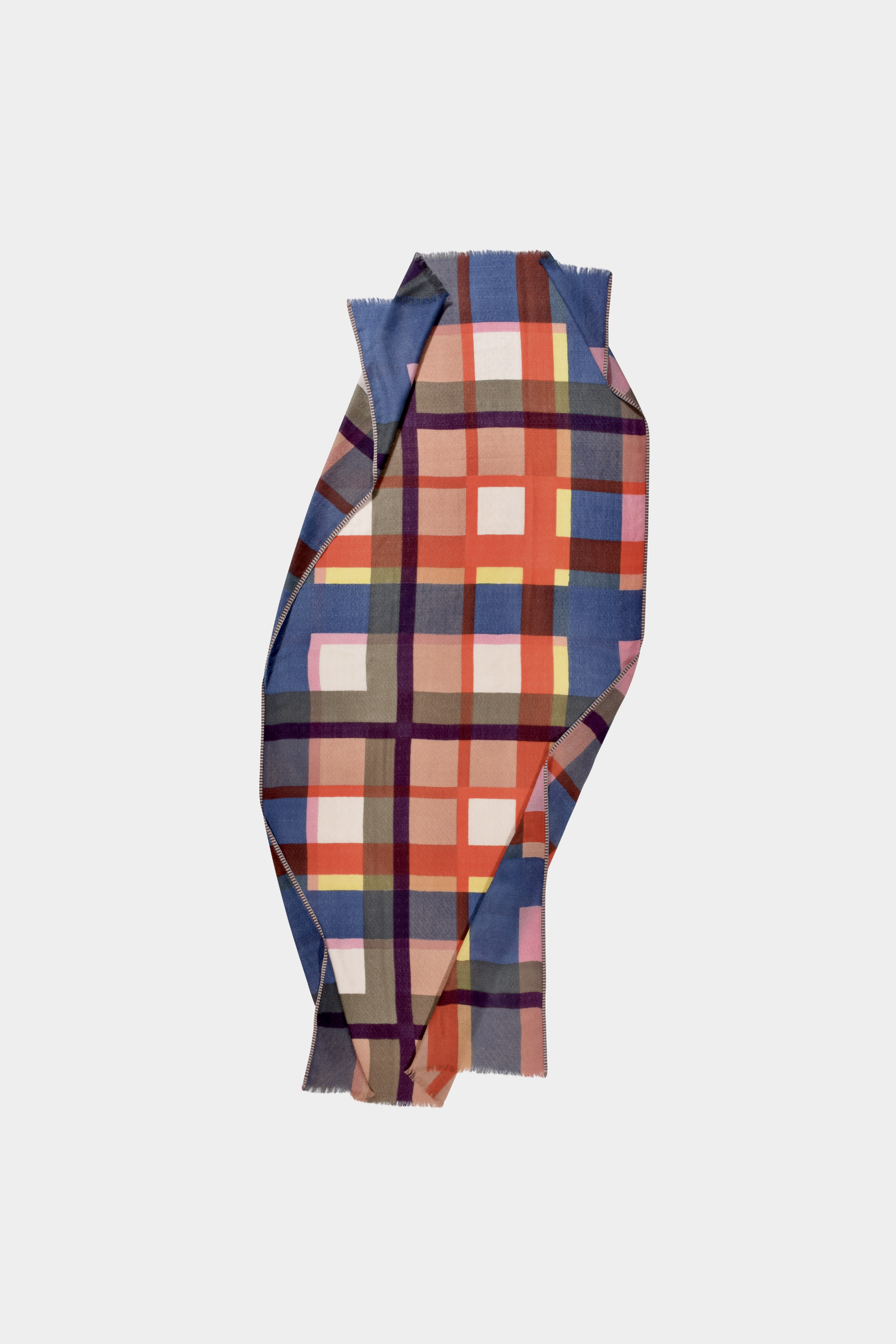Large stole, woven in a fine embossed diamond weave; soft hand feel. Iconic winter stole featuring 8 colors. Large Check Pattern with contrasting lines and colors creating playful optical illusions. Elegant Jacquard border and short pin fringe. Hand screen printing, 1 screen per color.