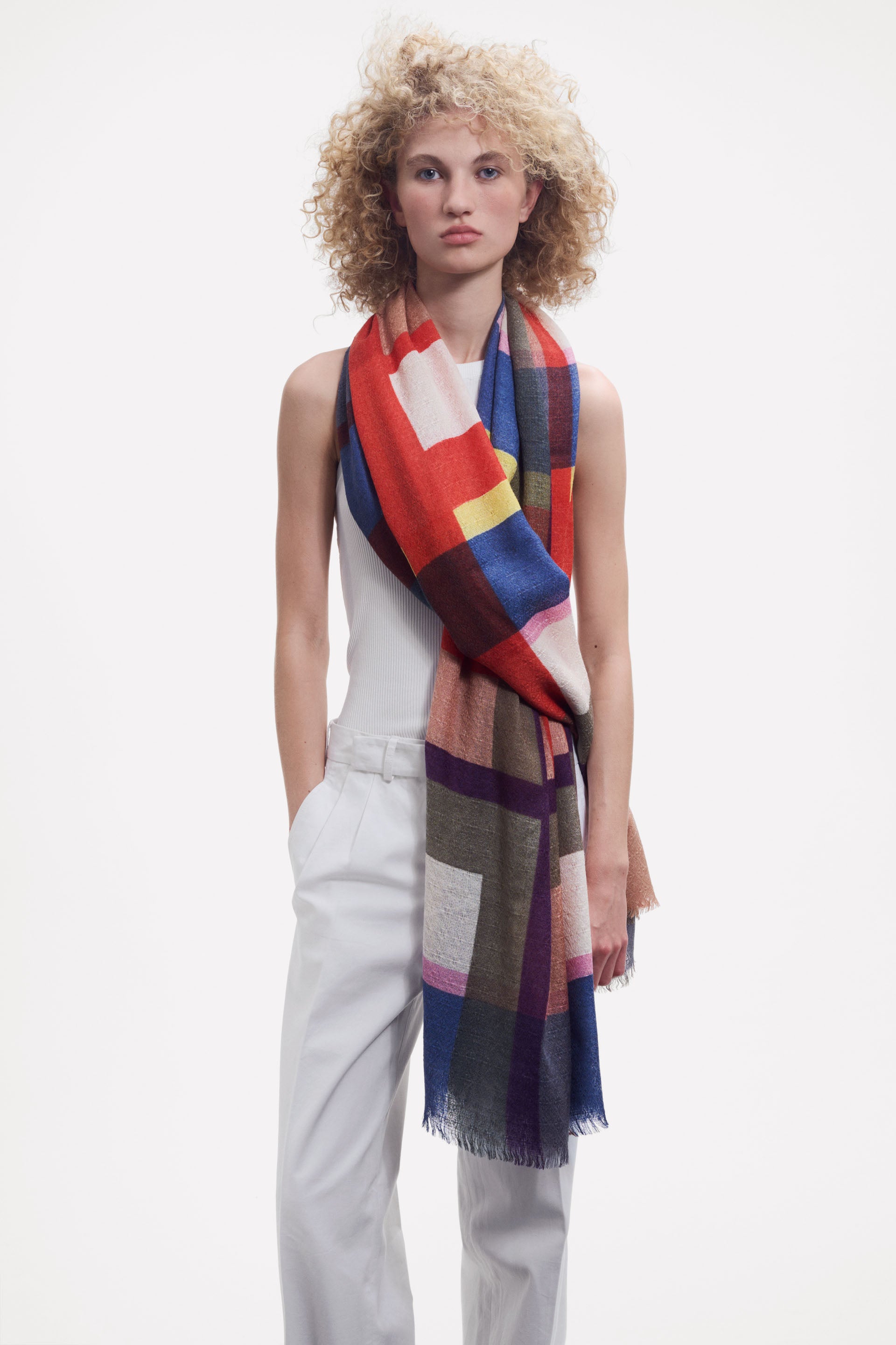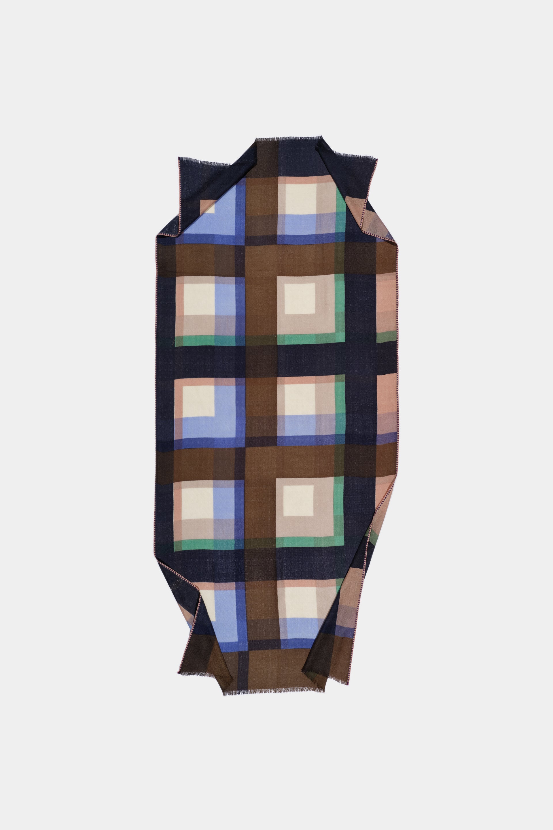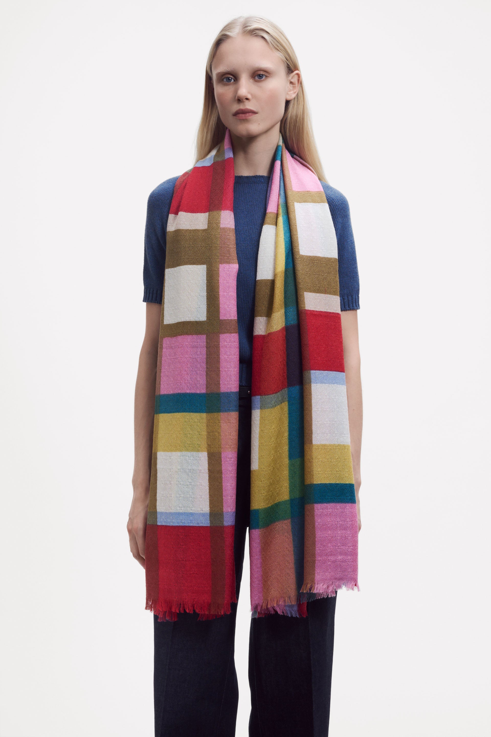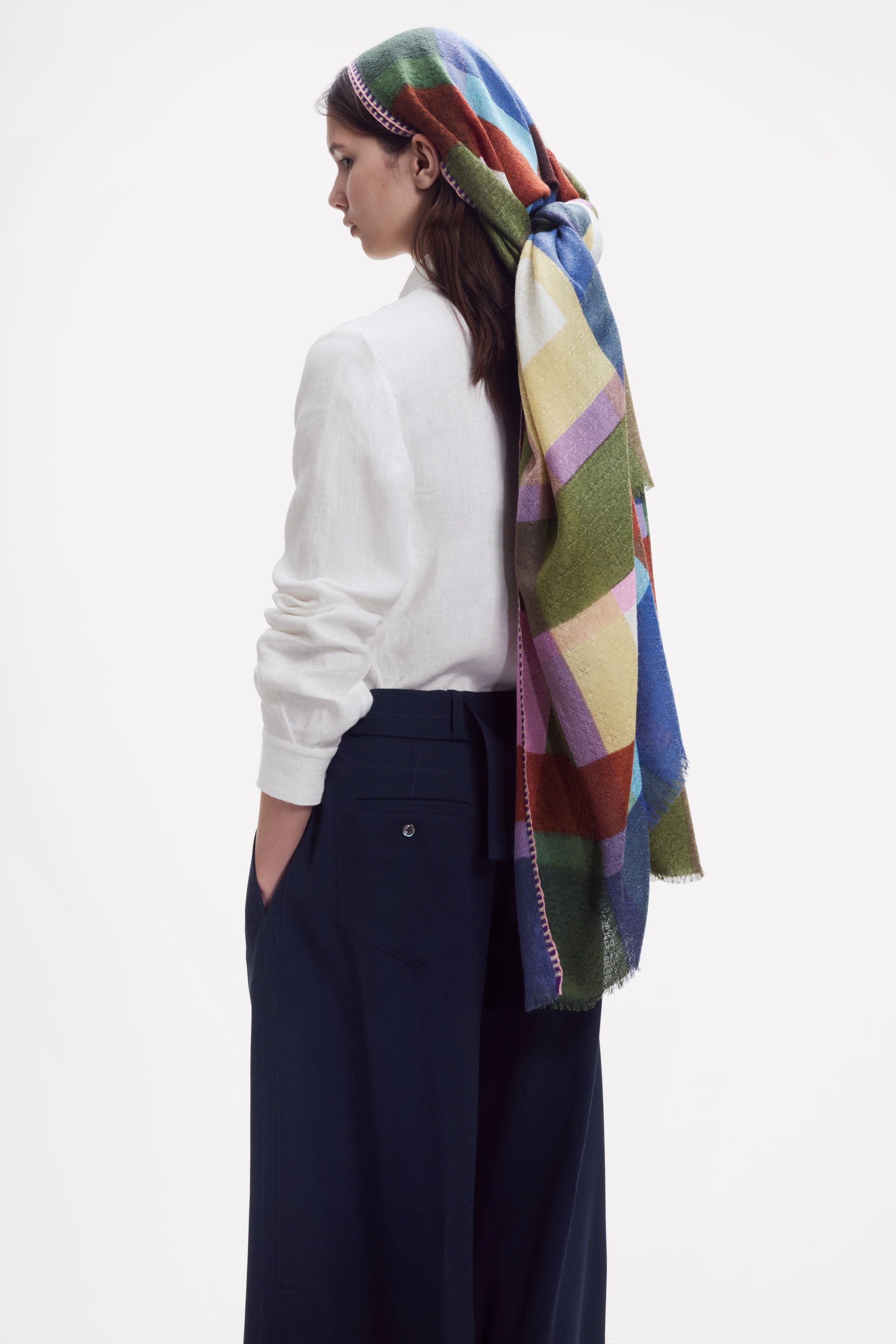 Large stole, woven in a fine embossed diamond weave; soft hand feel. Iconic winter stole featuring 8 colors. Large Check Pattern with contrasting lines and colors creating playful optical illusions. Elegant Jacquard border and short pin fringe. Hand screen printing, 1 screen per color.