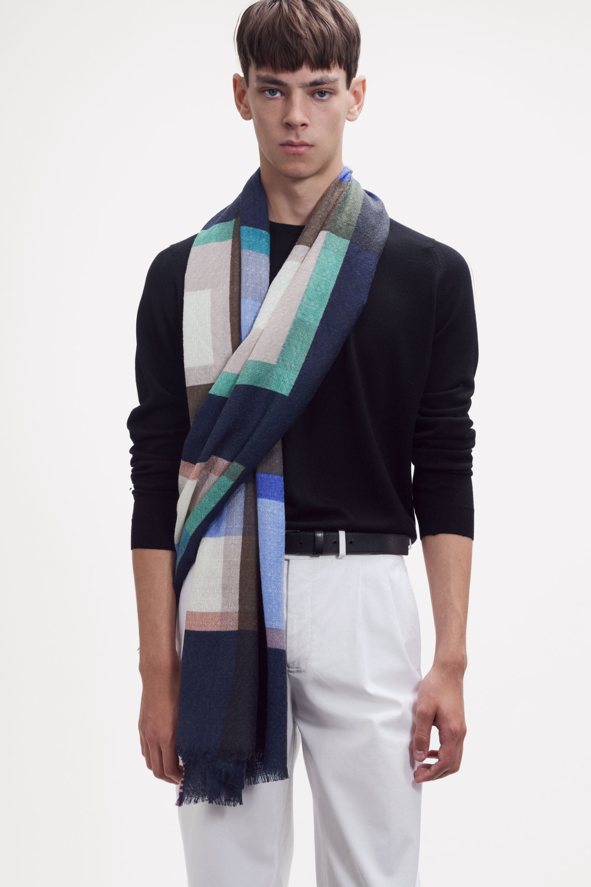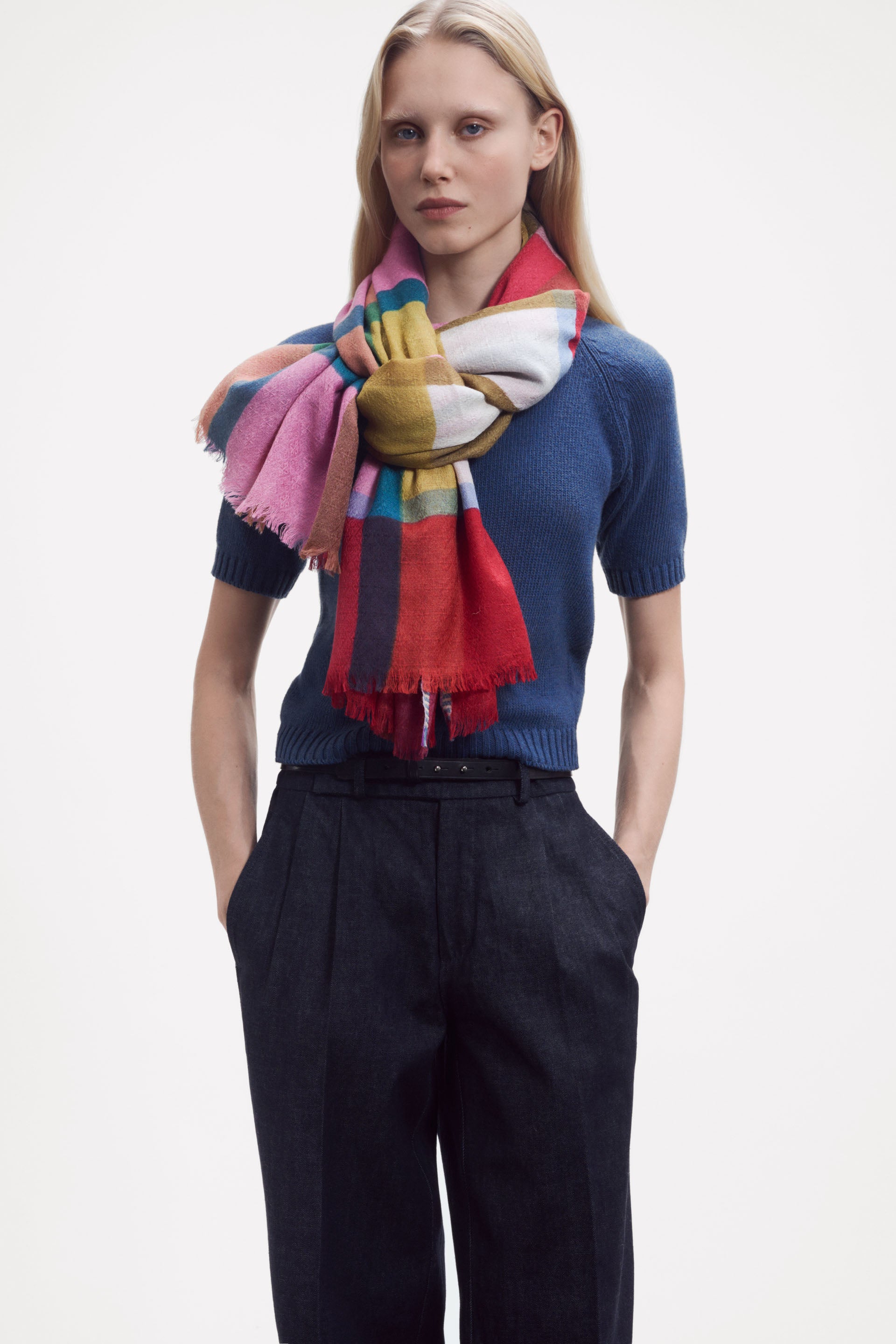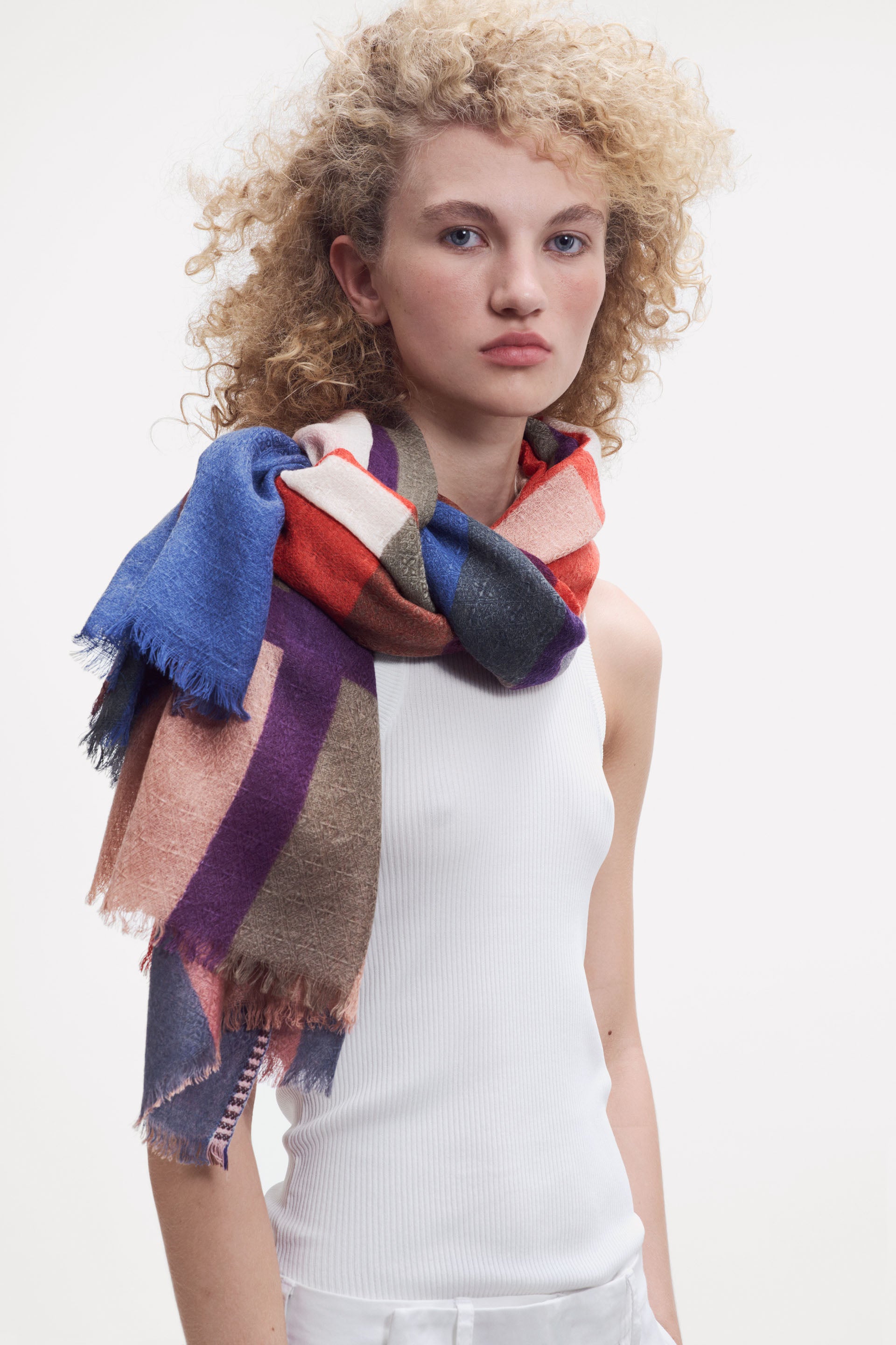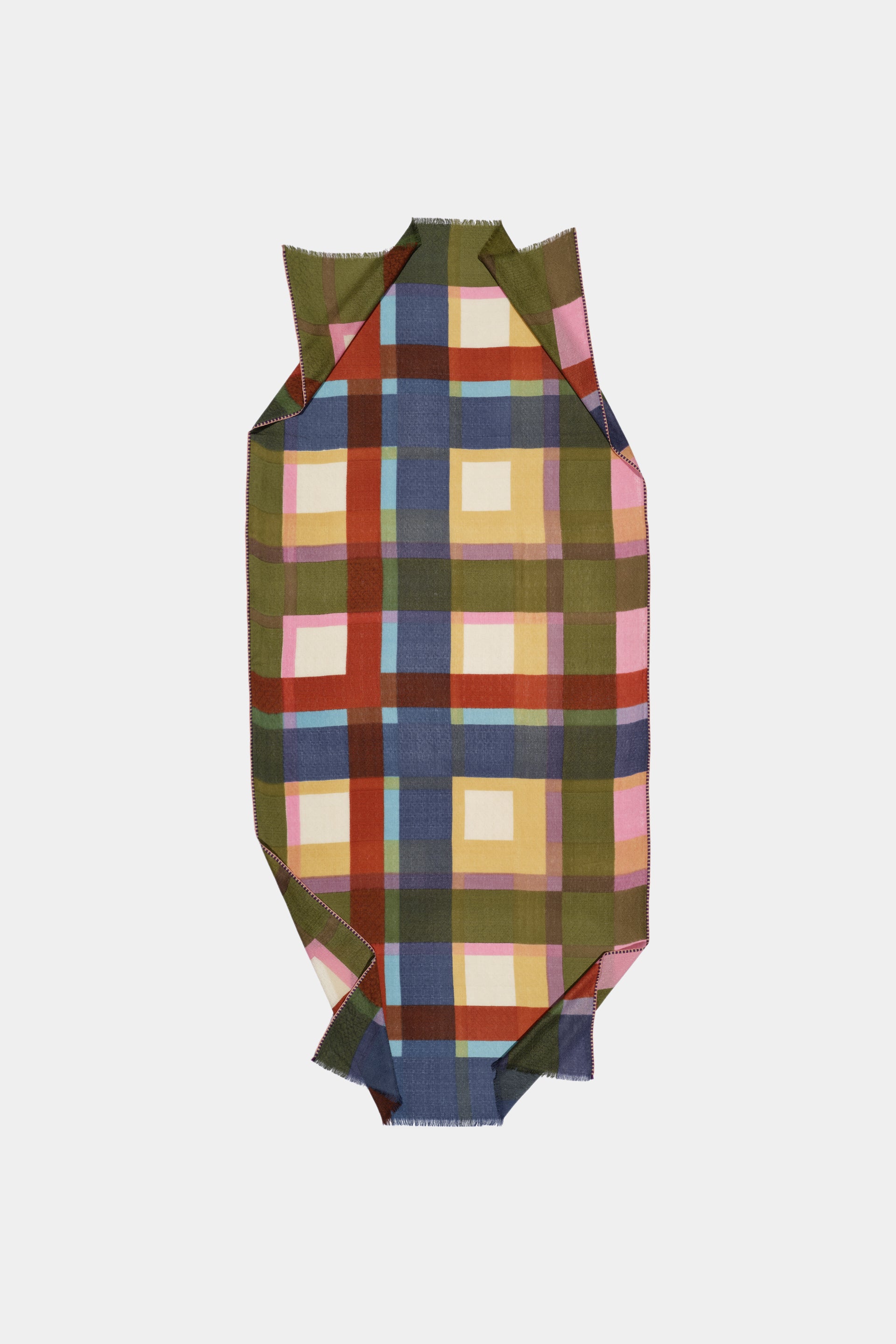 Large stole, woven in a fine embossed diamond weave; soft hand feel. Iconic winter stole featuring 8 colors. Large Check Pattern with contrasting lines and colors creating playful optical illusions. Elegant Jacquard border and short pin fringe. Hand screen printing, 1 screen per color.