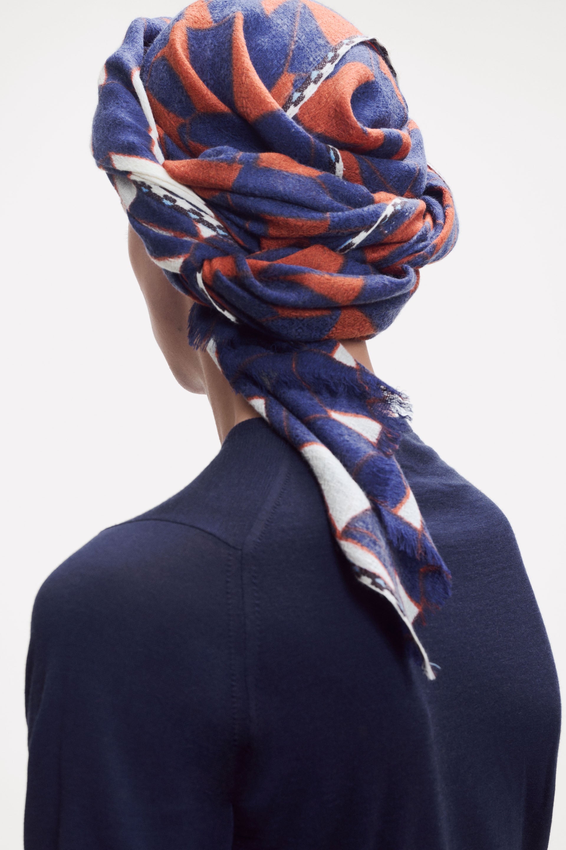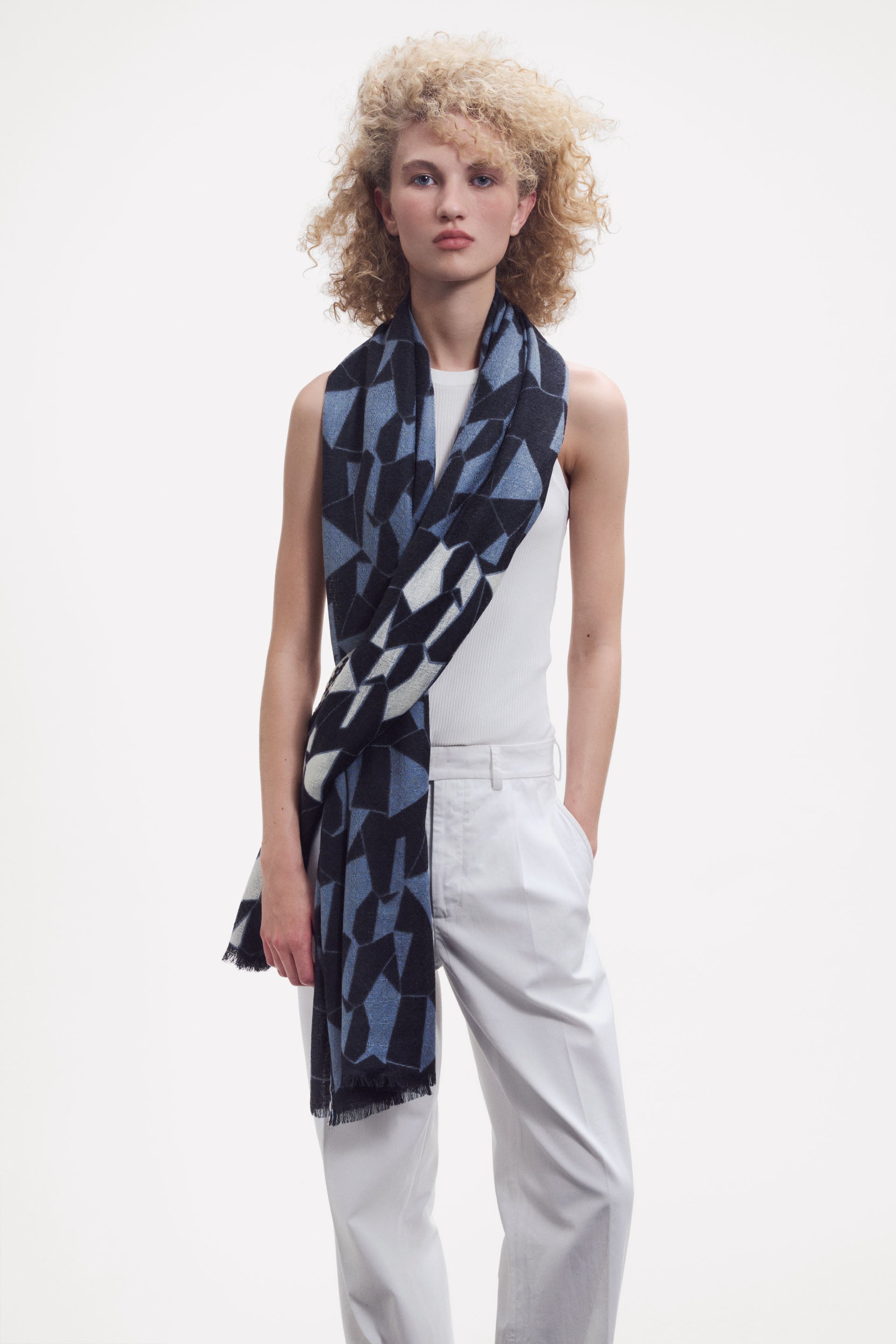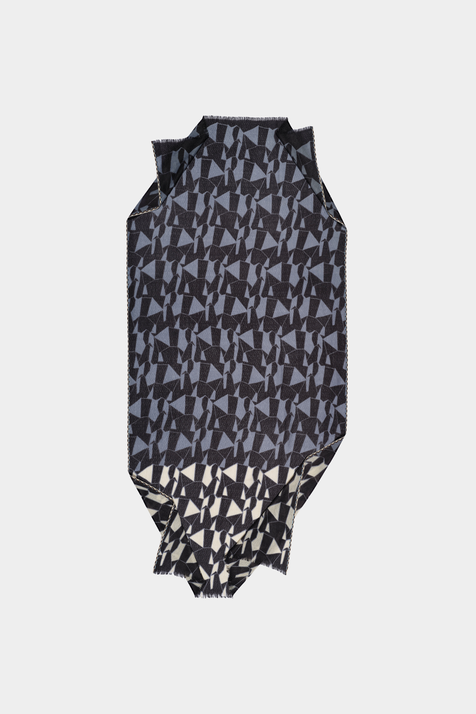 Thin, lightweight stole, in a subtly textured diamond weave. The elegant pattern draws inspiration from Arne Jacobsen’s textile work and the folds of origami. The Elephant motif, symbol of wisdom and loyalty, emerges through contrasting color combinations. A refined Jacquard border is adapted to each colorway. Finished with a fine short fringe. Hand screen printing; 1 screen per color.