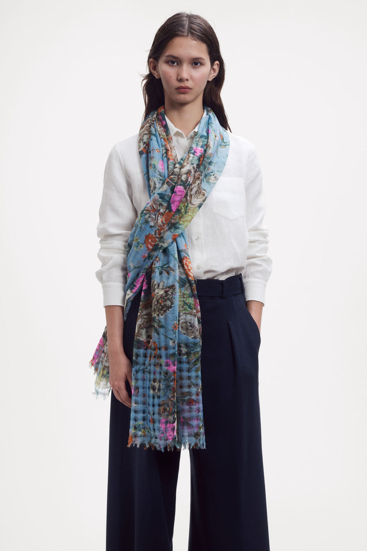 Large woven stole with open weave; soft hand feel. A delicate airy weave for this dense floral pattern made of 14 colors that seem to be melting into the loose weave. A sophisticated stole for every season, year-round. Hand screen printing.