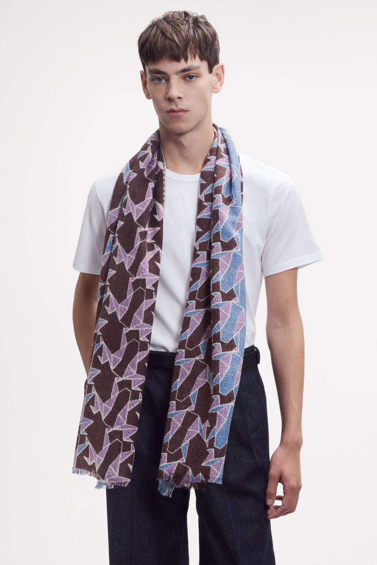 Thin, lightweight stole, in a subtly textured diamond weave. This elegant, playful design is inspired by Arne Jacobsen’s textile work and the geometry of origami. The Jumping frog motif, symbol of luck and prosperity, is revealed by a color palette that brings movement and depth to the overall design. Finished with a refined Jacquard border adapted to each colorway. Fine fringe at both ends. Hand screen printing; 1 screen per color
