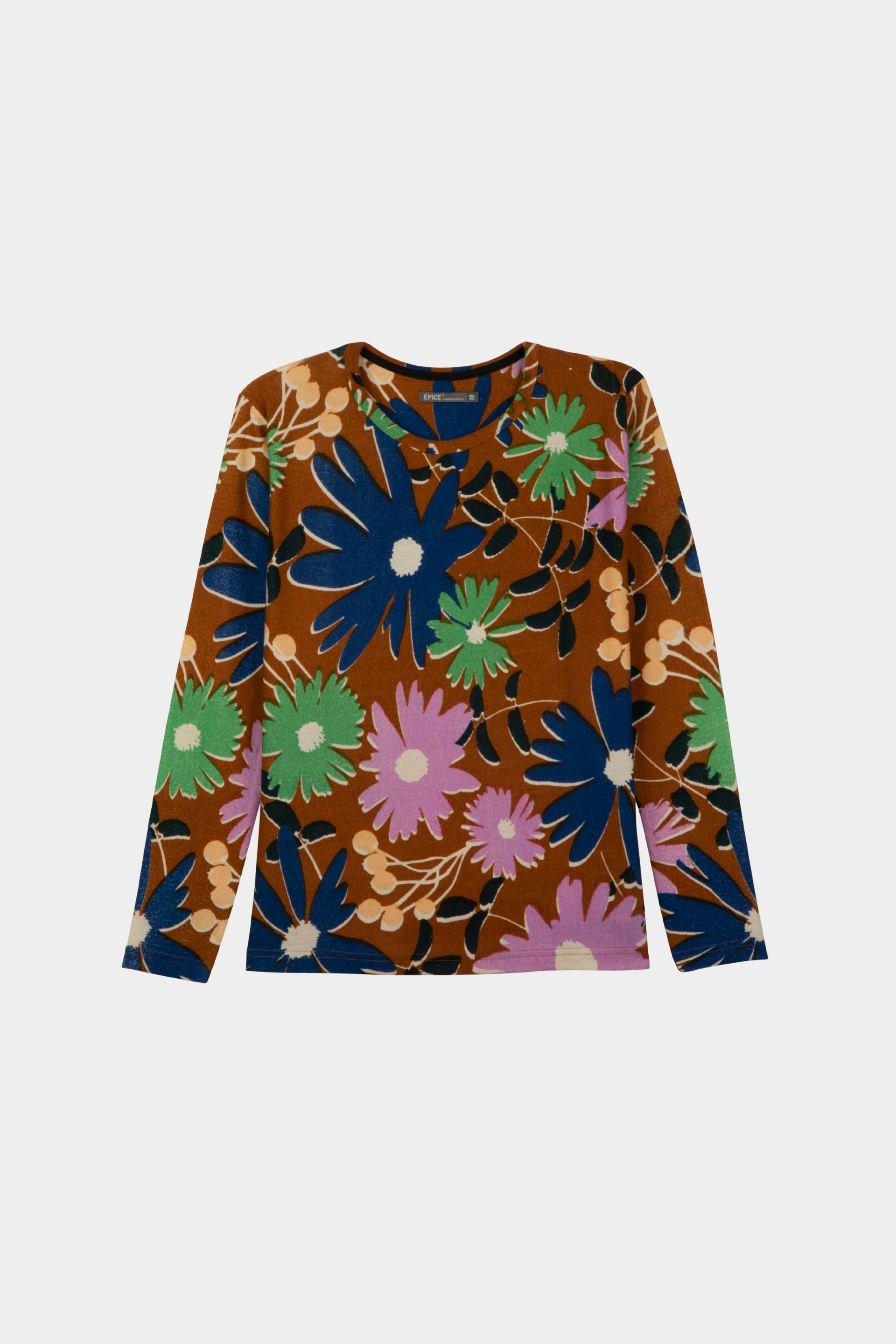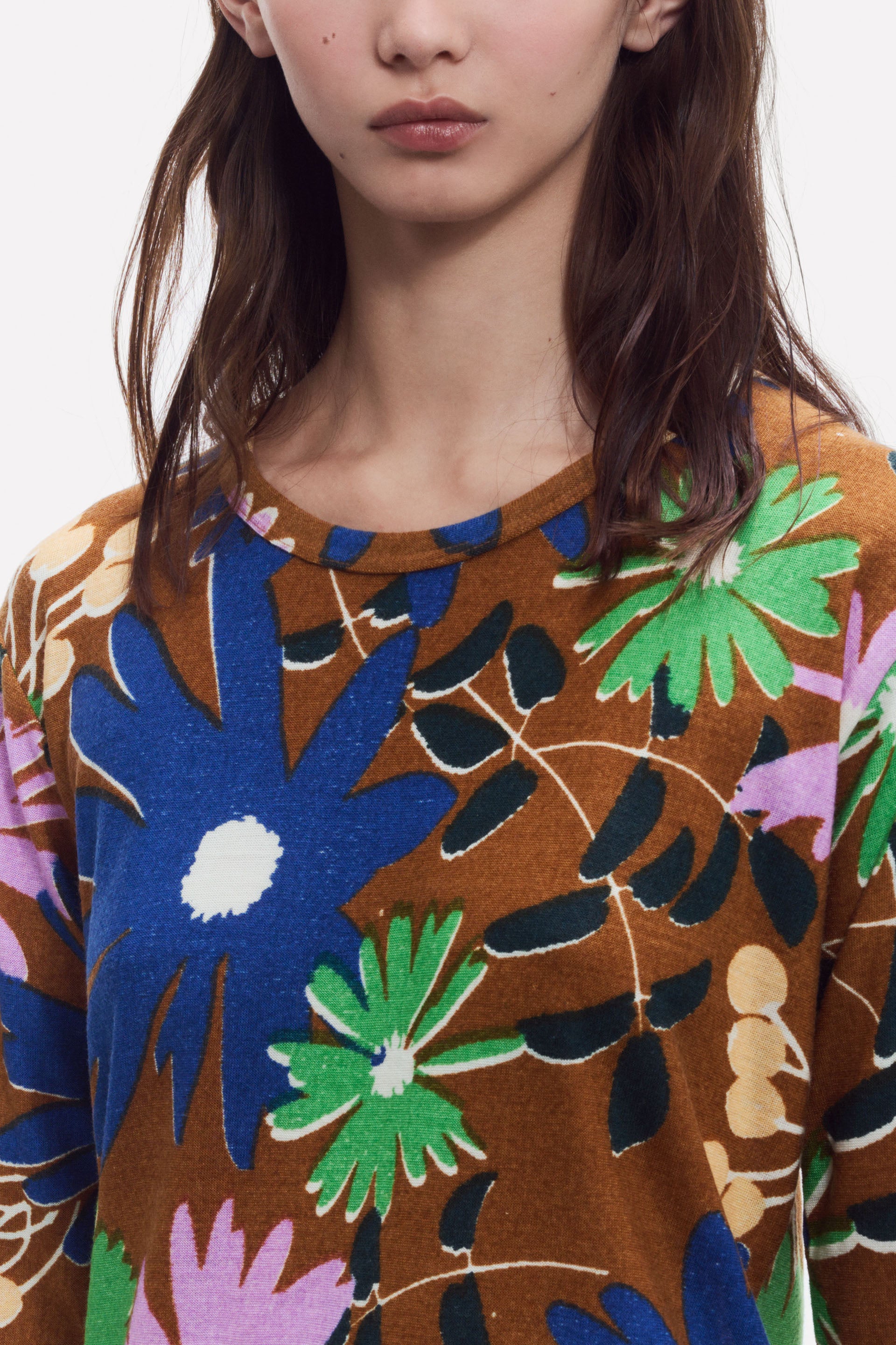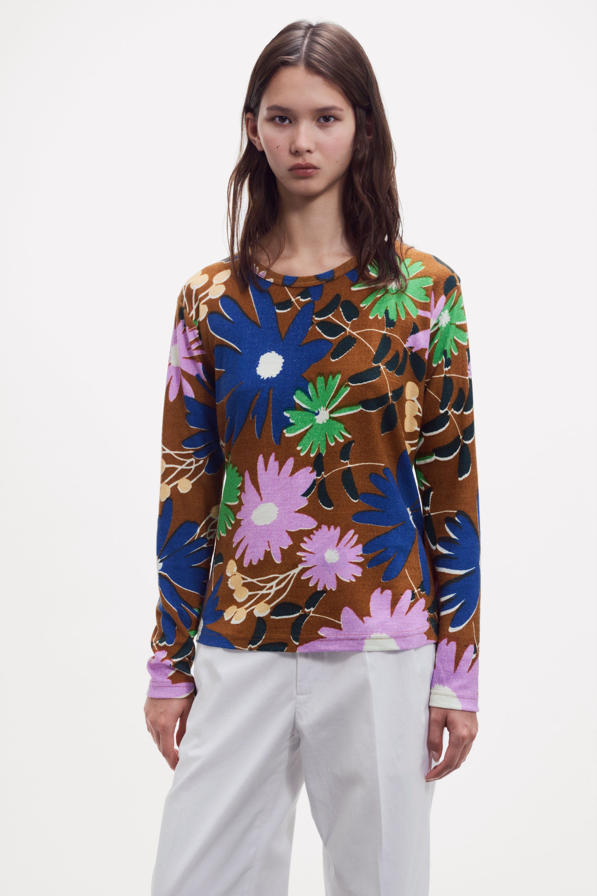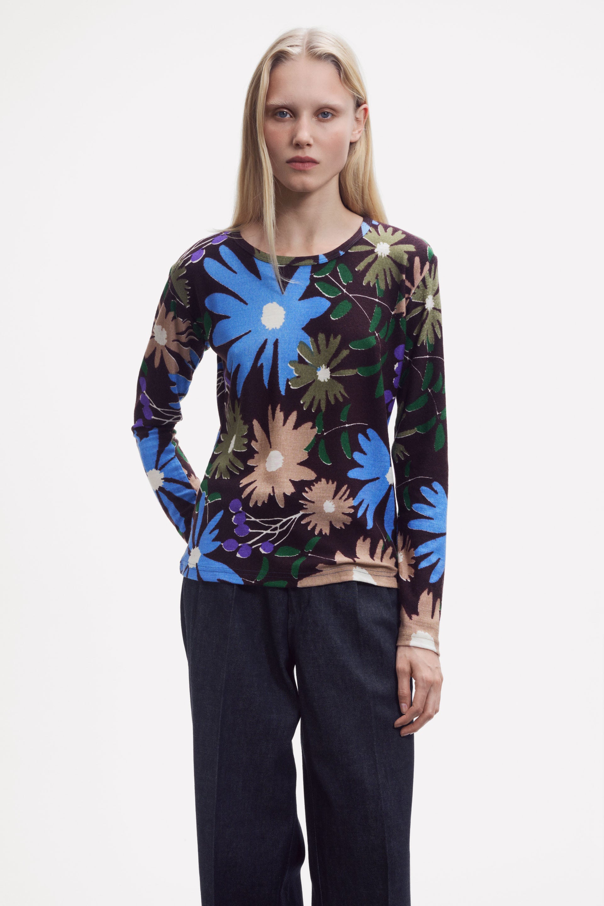 Long sleeve T-shirt in fine merino wool, soft and comfortable. Features a new floral design with daisies and asters, reimagined in clean, expressive lines that highlight the natural shapes of the flowers. A bold look, that pairs perfectly with our stoles. Adapted from our stoles GW 2581. Hand screen printing; 1 screen per color.