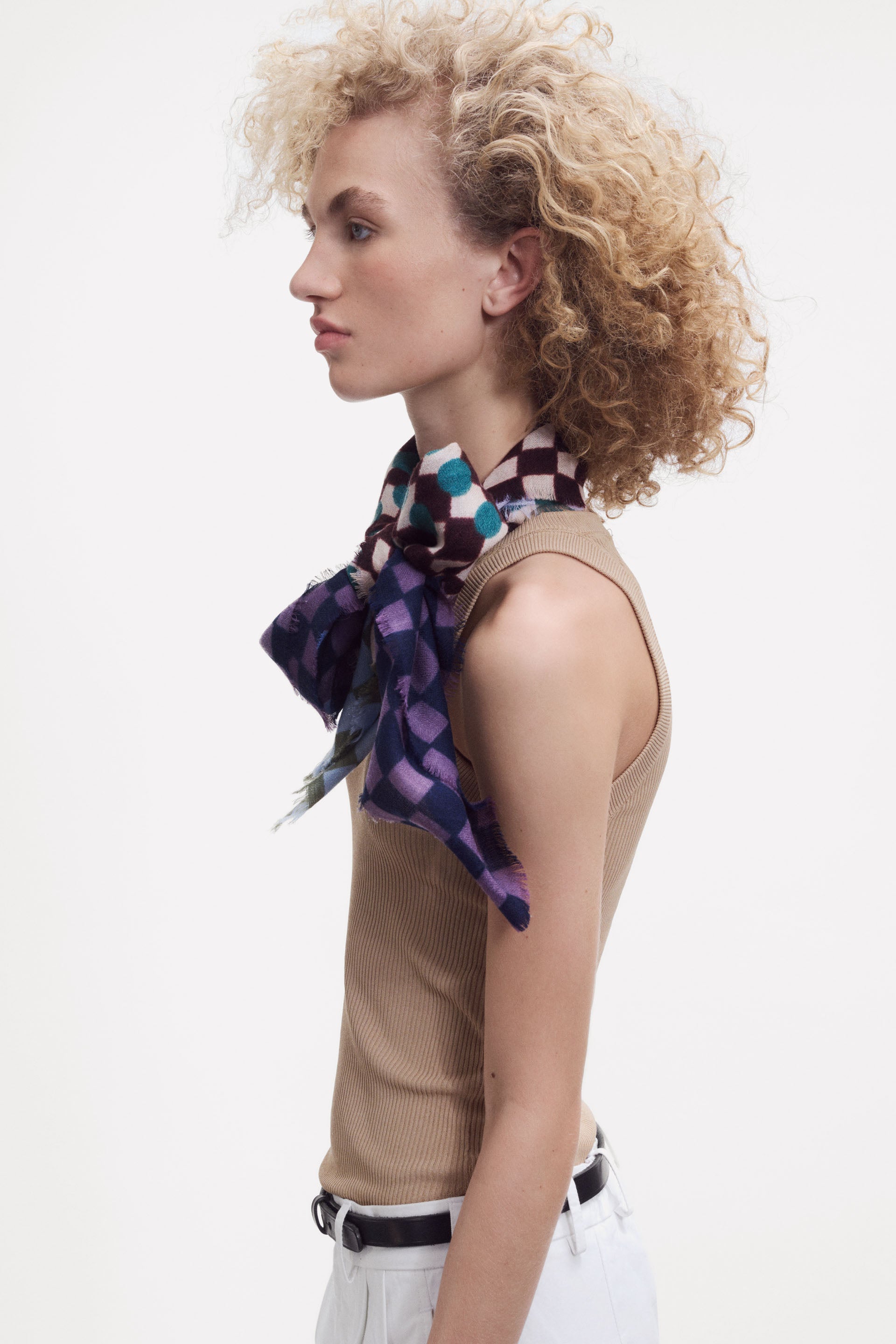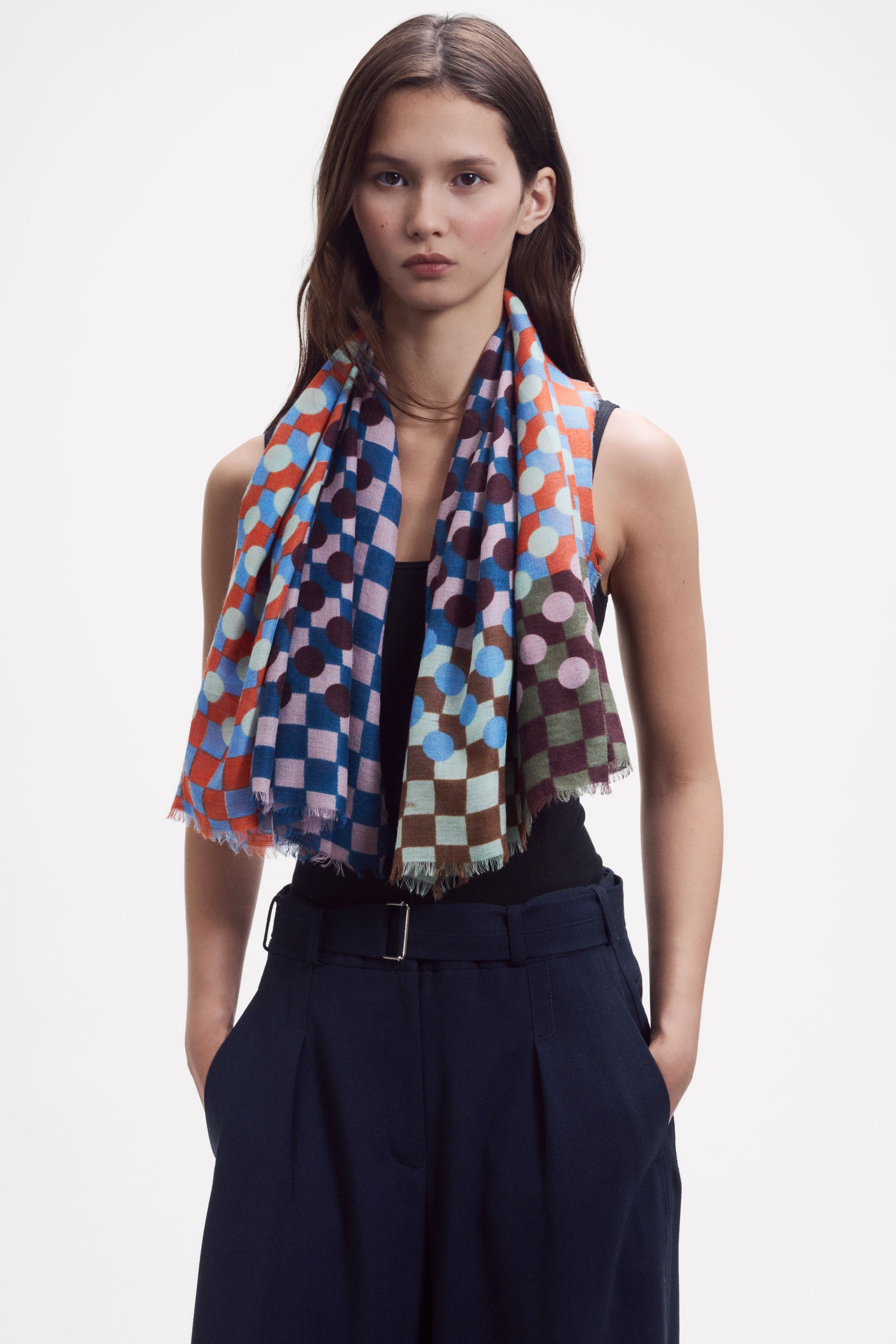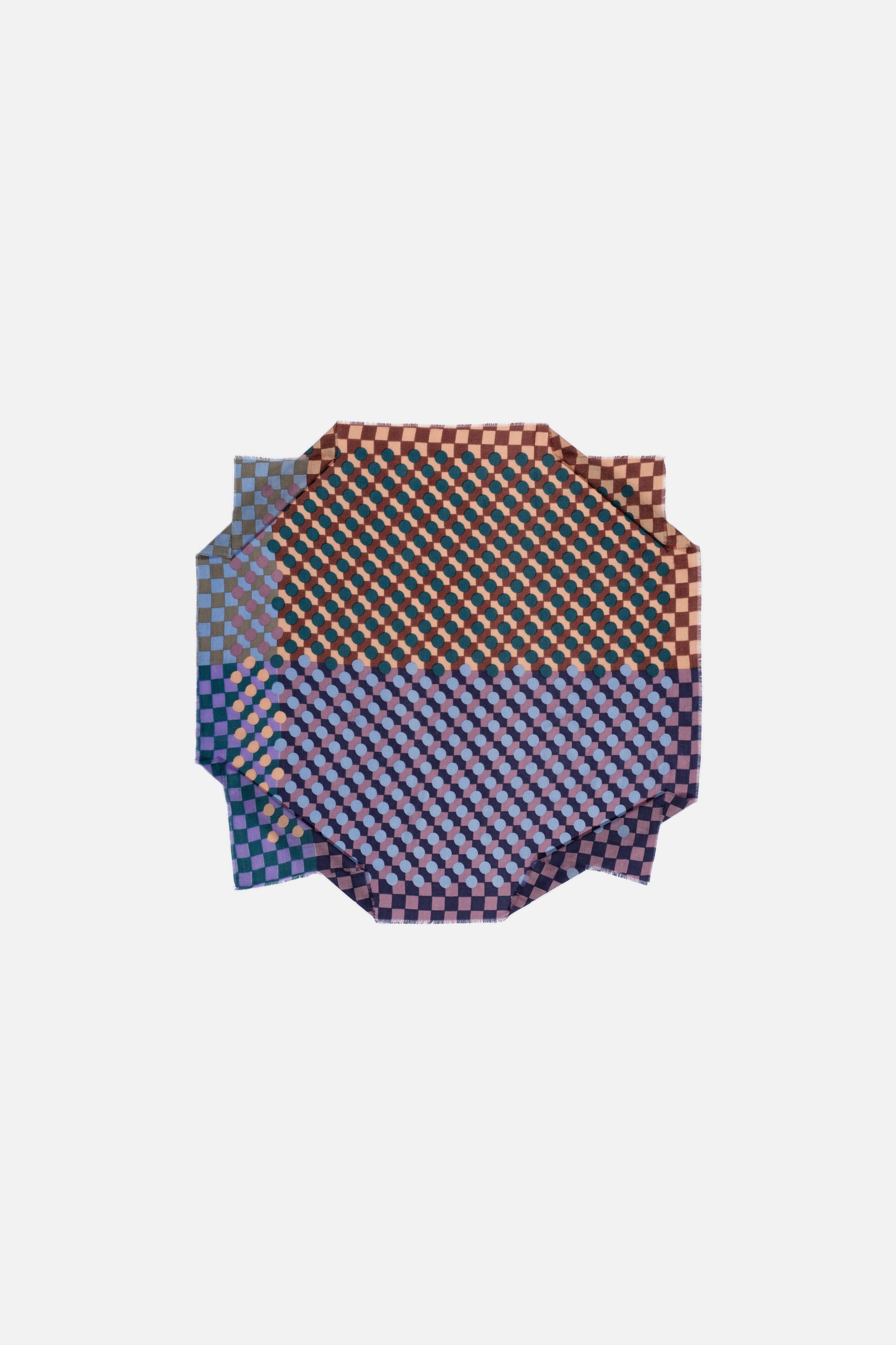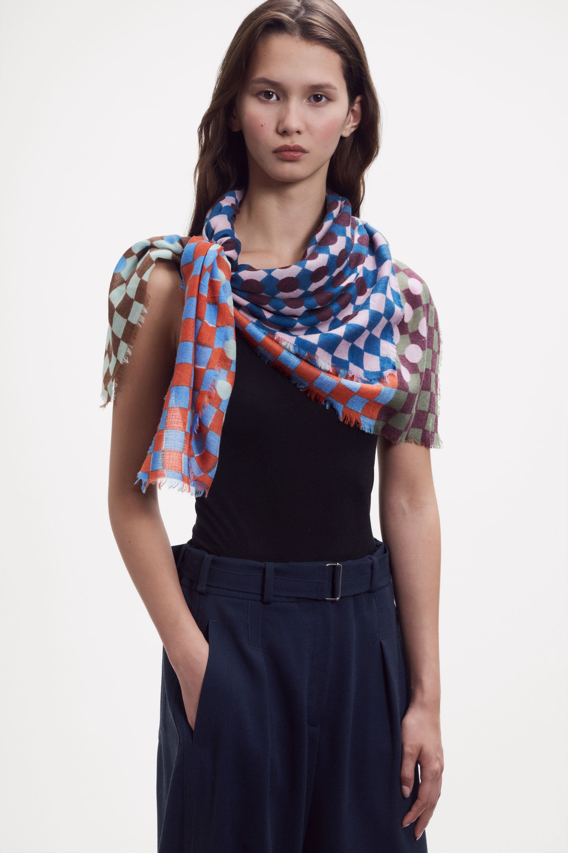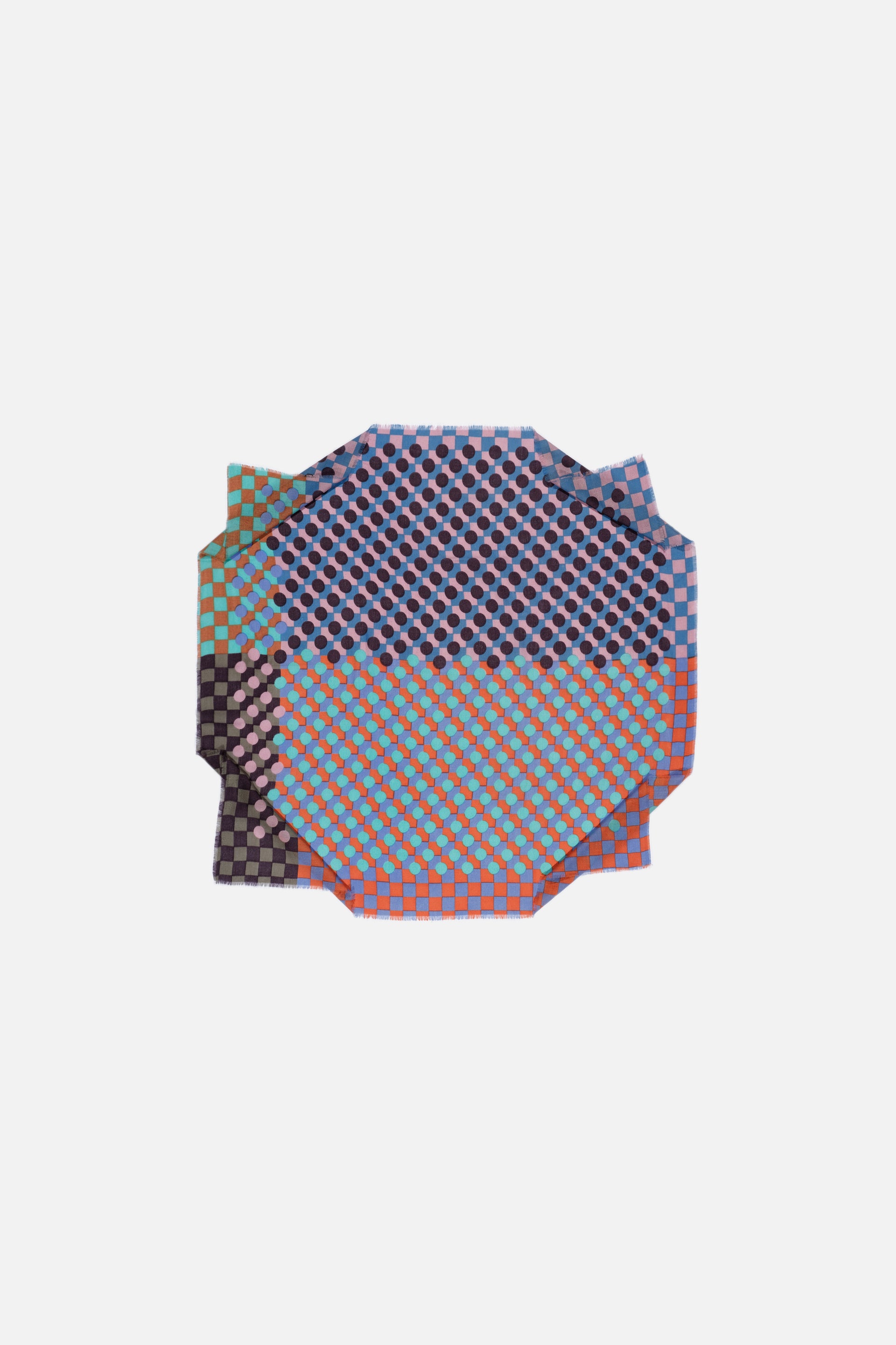 Extra-large square scarf woven in a finely textured diamond weave. This refined, airy piece is crafted from a luxurious blend of wool, silk, and cashmere. The color block layout features a Graphic pattern of checks and dots, enhanced by a vibrant palette and playful optical illusions. When draped or tied, the design reveals bold color combinations. Contrasting borders. Finished with a fine short fringe. Hand screen printing; 1 screen per color.