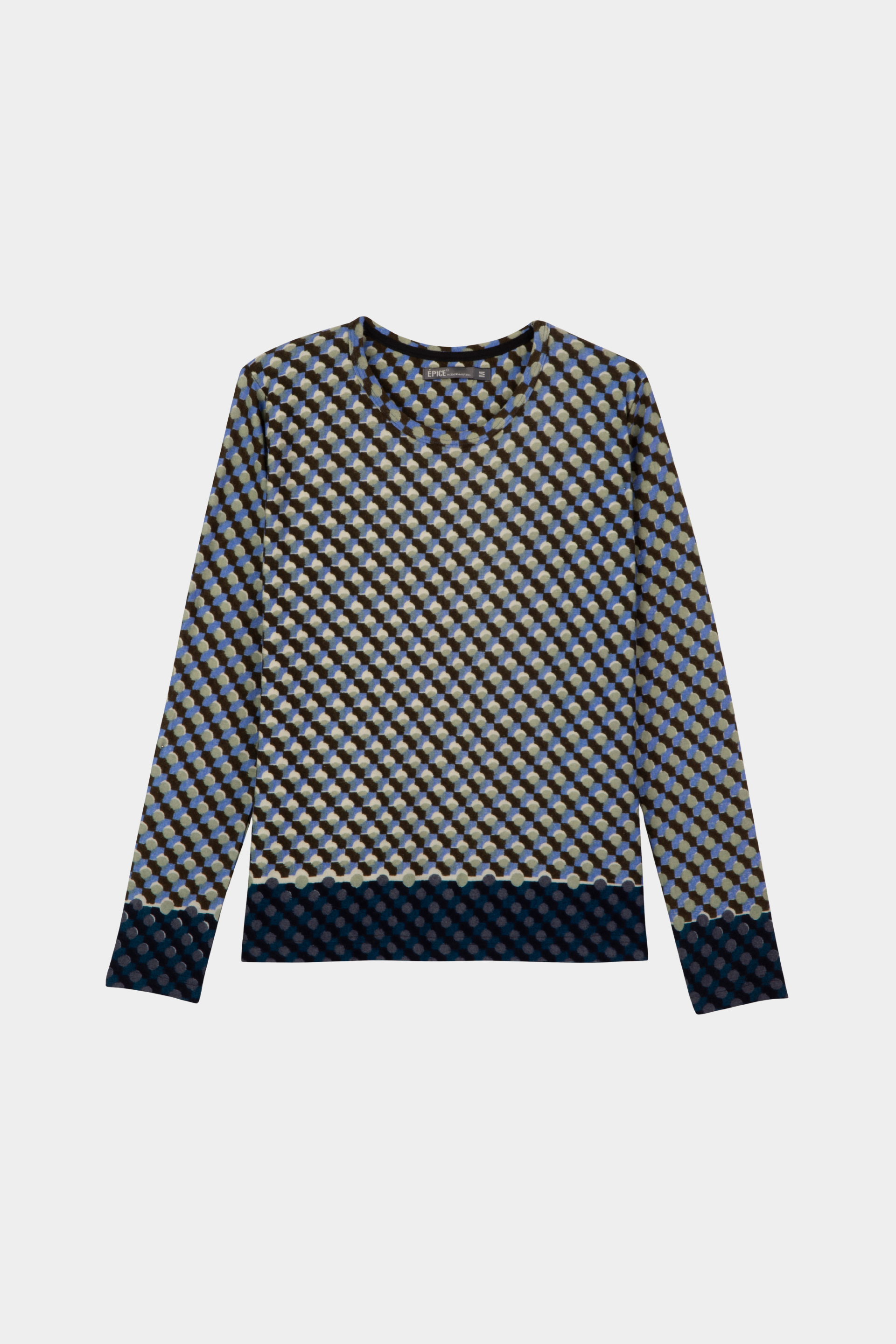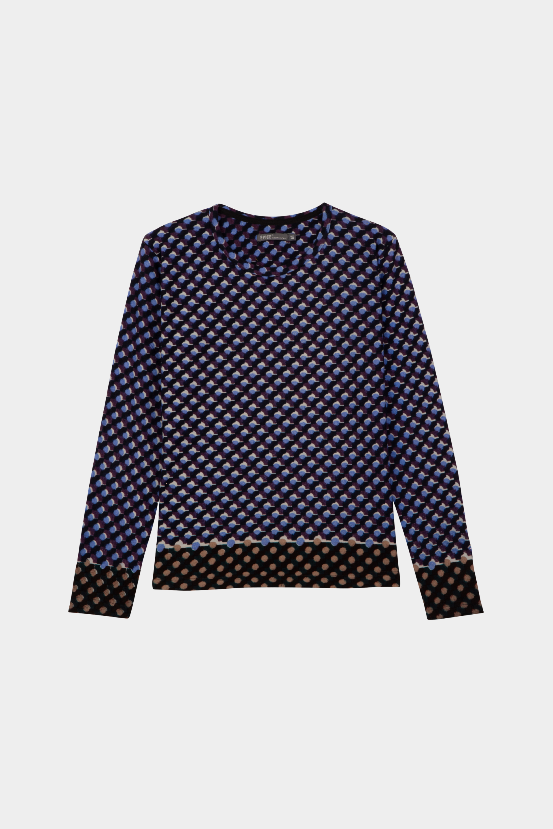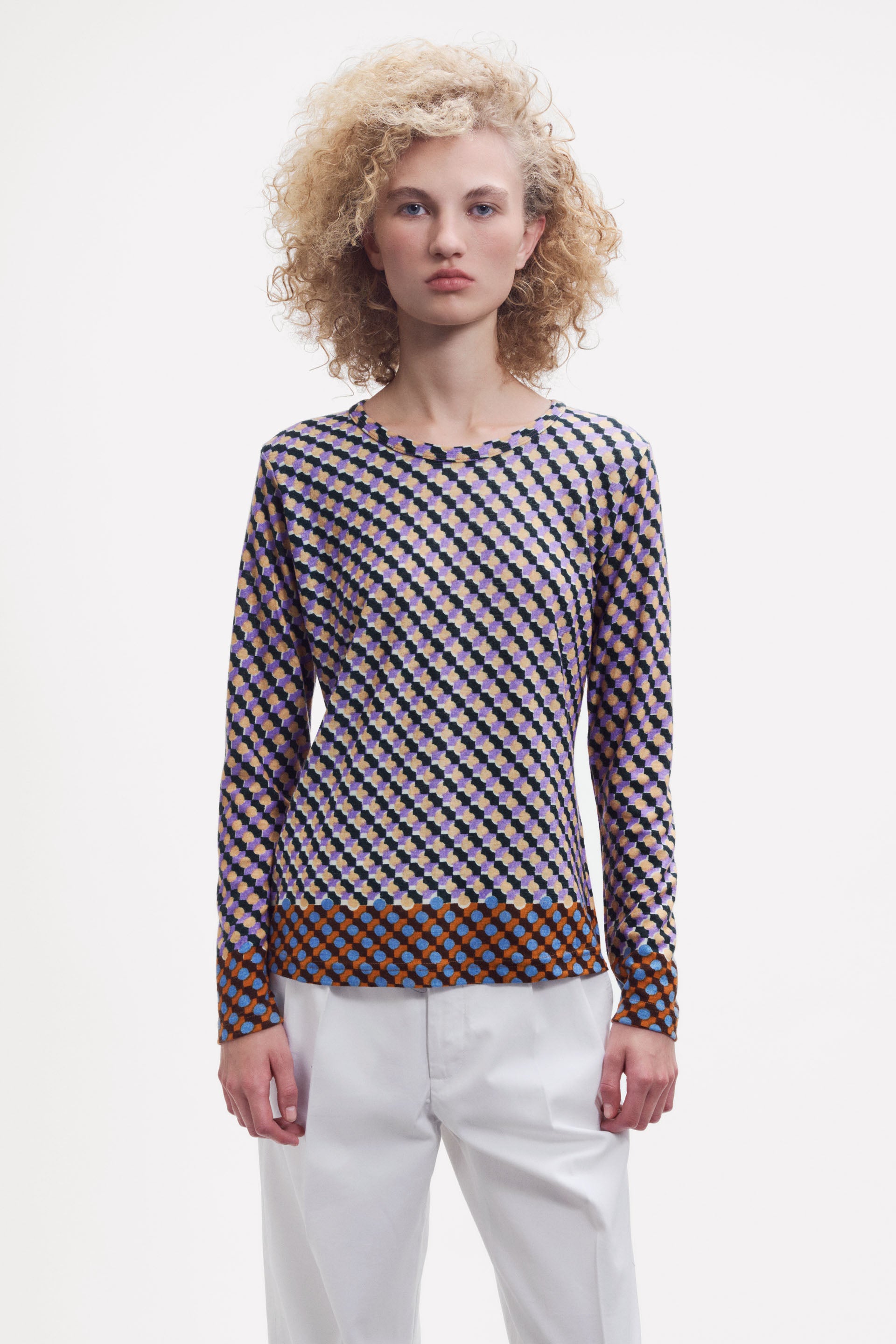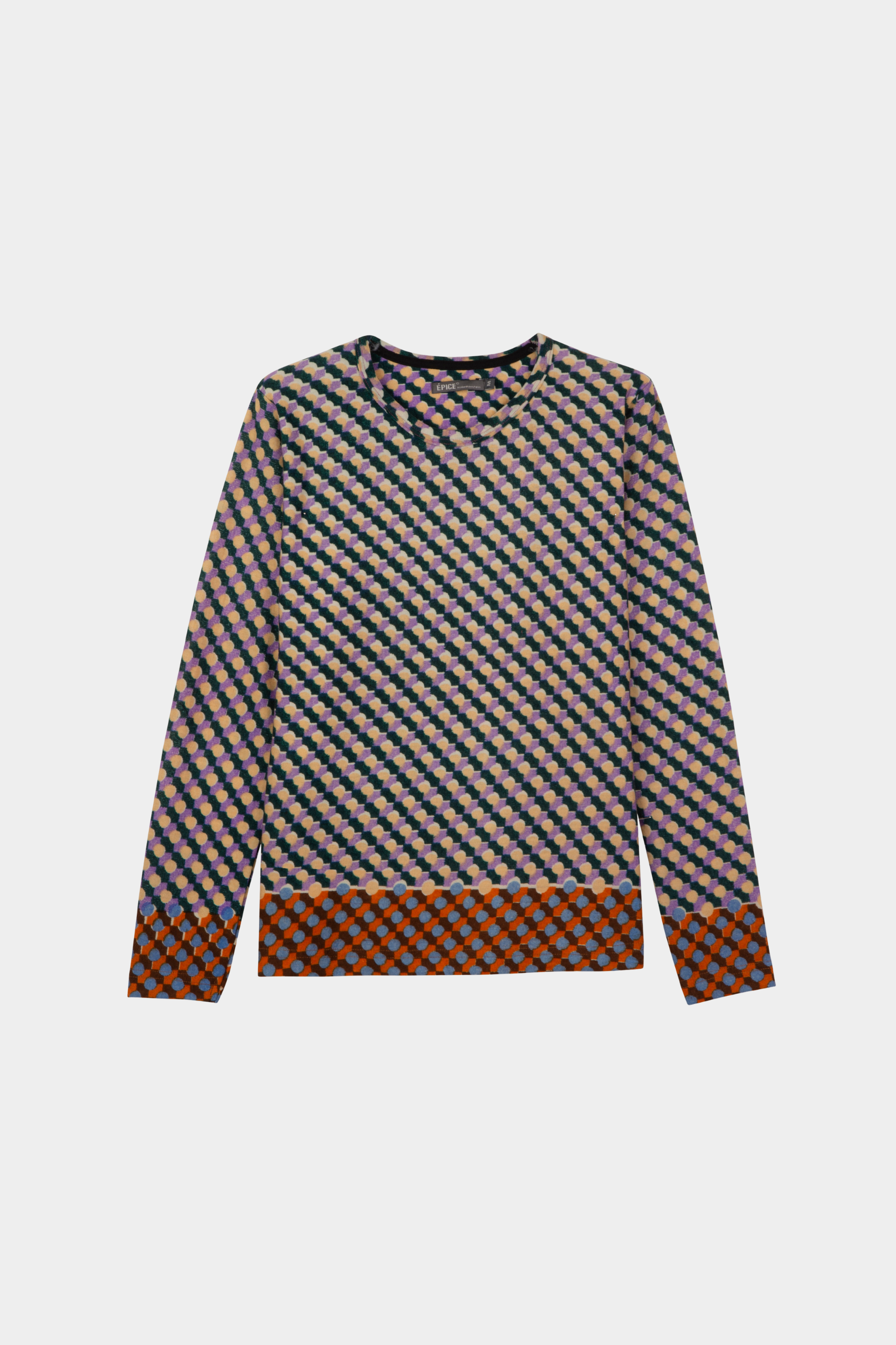 Tee-shirt à manches longues en fine laine mérinos, souple et agréable à porter. Motif Graphique composé de carreaux et pois, animé de subtiles jeux d’optique. Élégante bordure contrastée dans le bas. Modèle élégant, qui peut facilement accompagner nos étoles. Dessin décliné de nos étoles GW 2540. Impression en sérigraphie artisanale, soit 1 cadre pour chaque couleur.