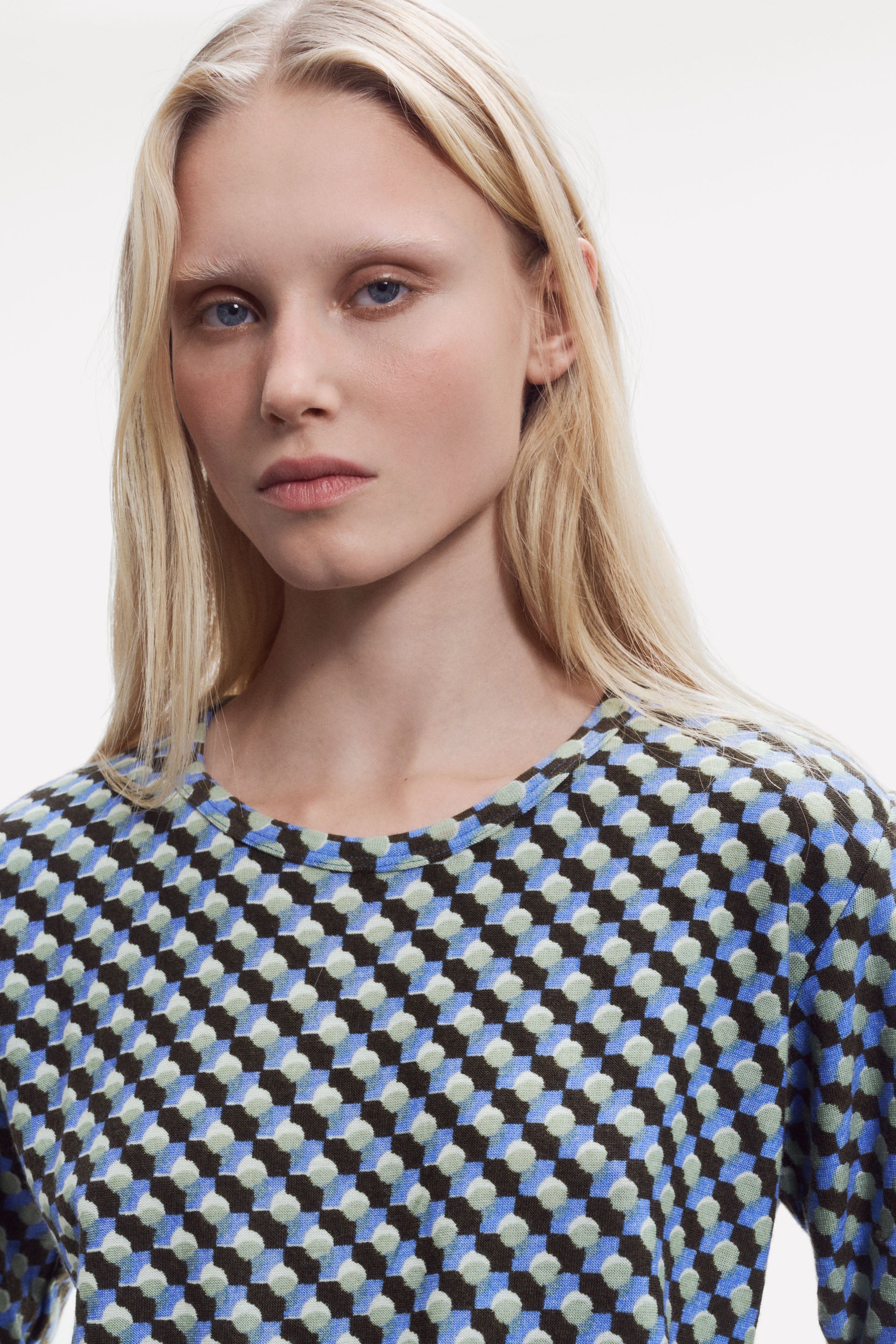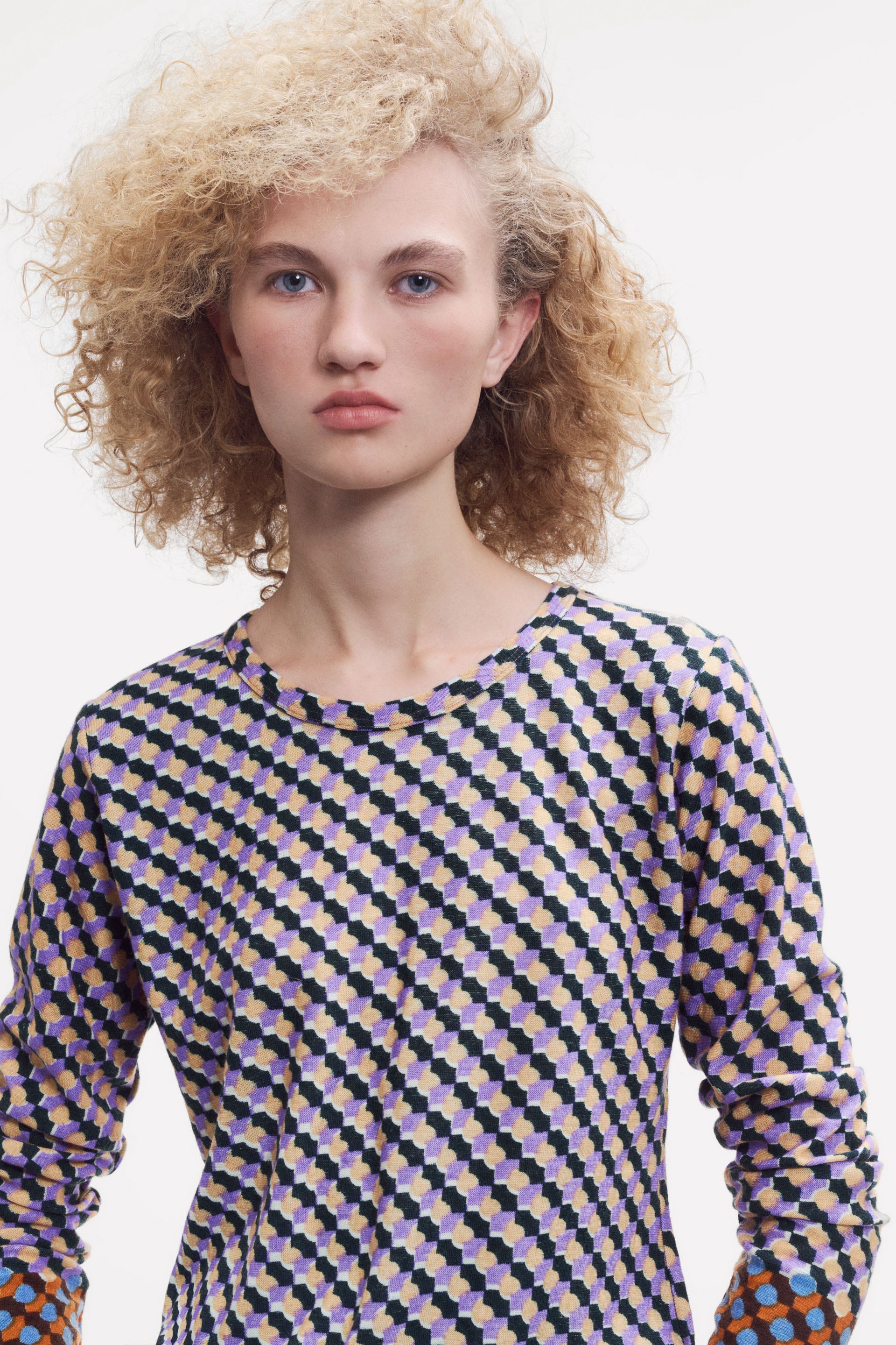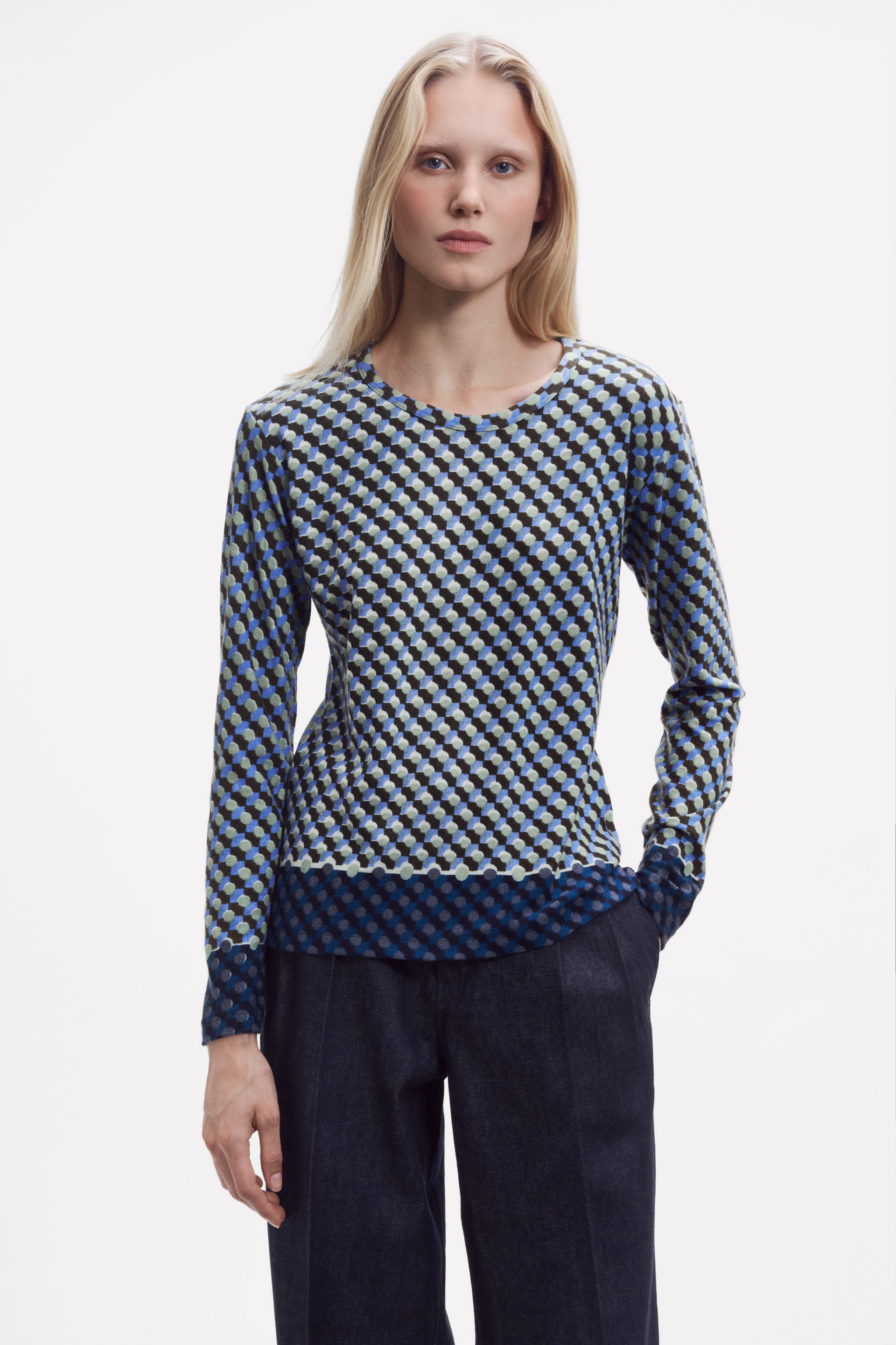 Tee-shirt à manches longues en fine laine mérinos, souple et agréable à porter. Motif Graphique composé de carreaux et pois, animé de subtiles jeux d’optique. Élégante bordure contrastée dans le bas. Modèle élégant, qui peut facilement accompagner nos étoles. Dessin décliné de nos étoles GW 2540. Impression en sérigraphie artisanale, soit 1 cadre pour chaque couleur.