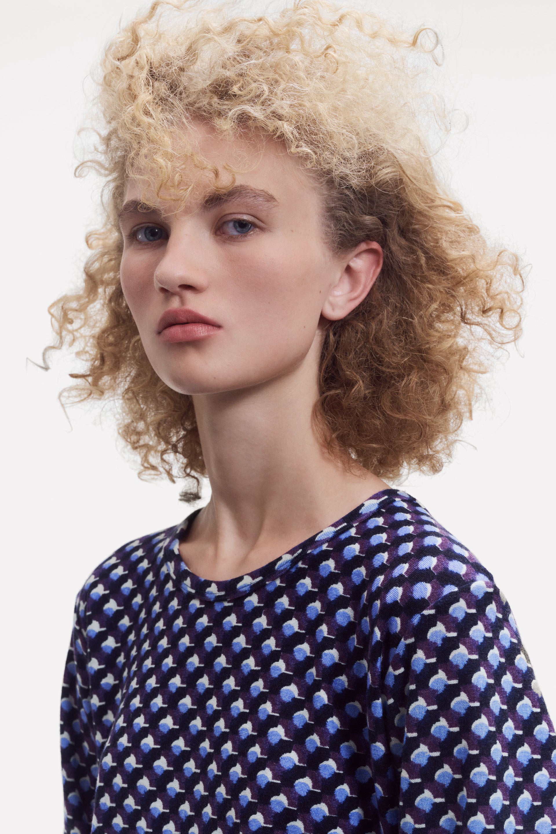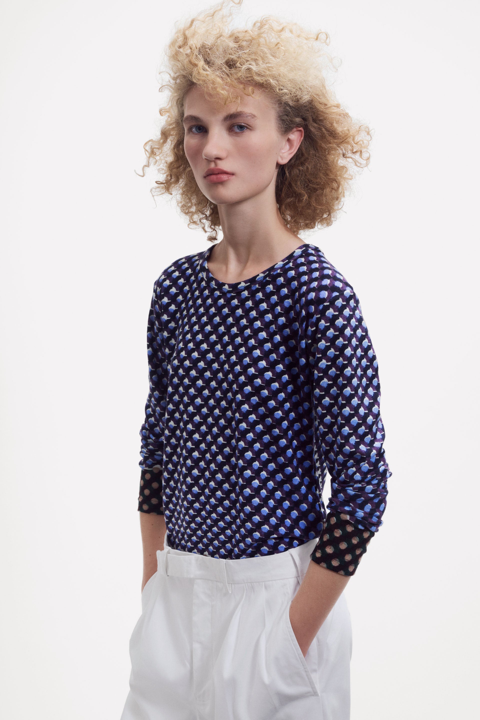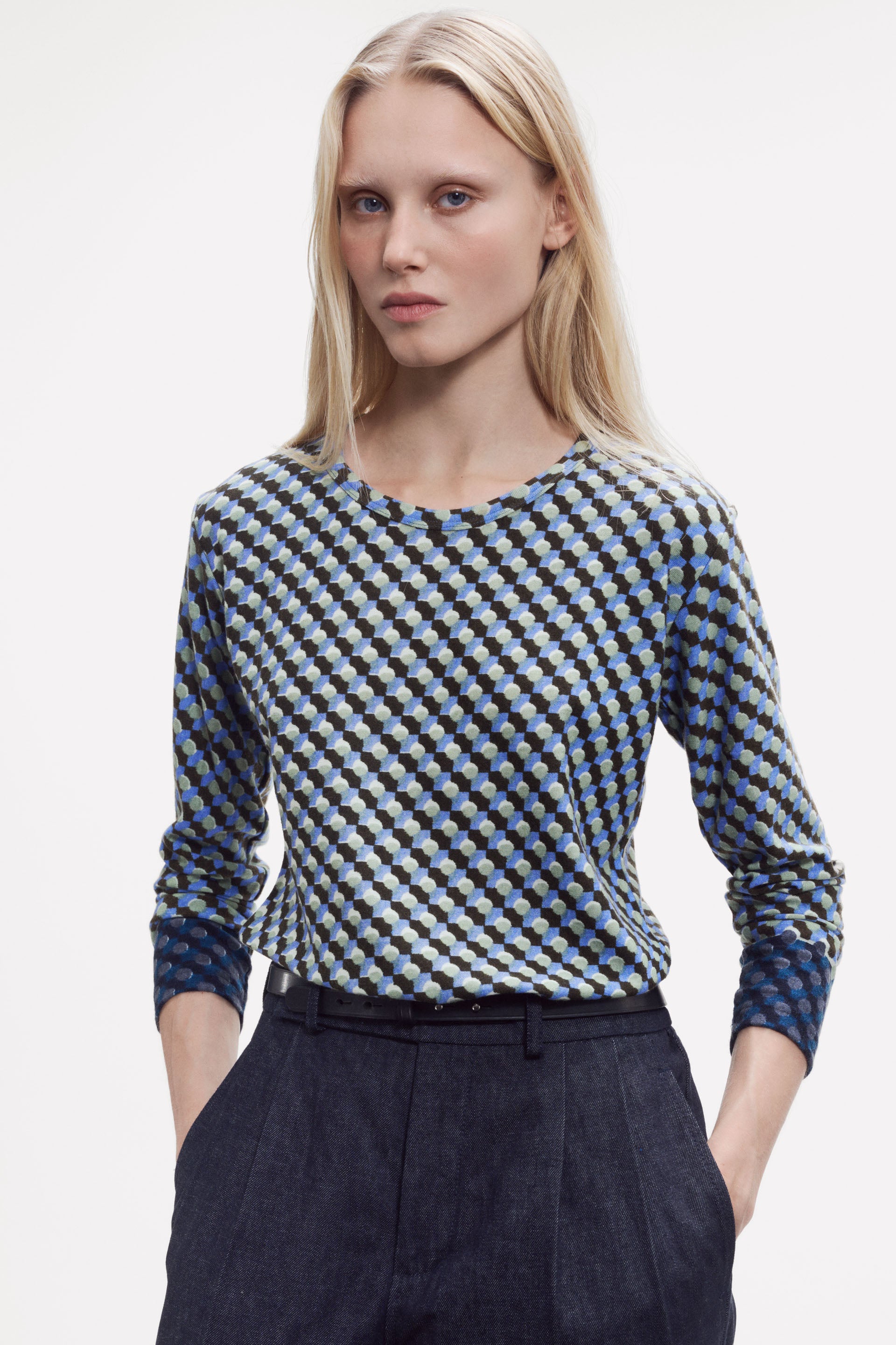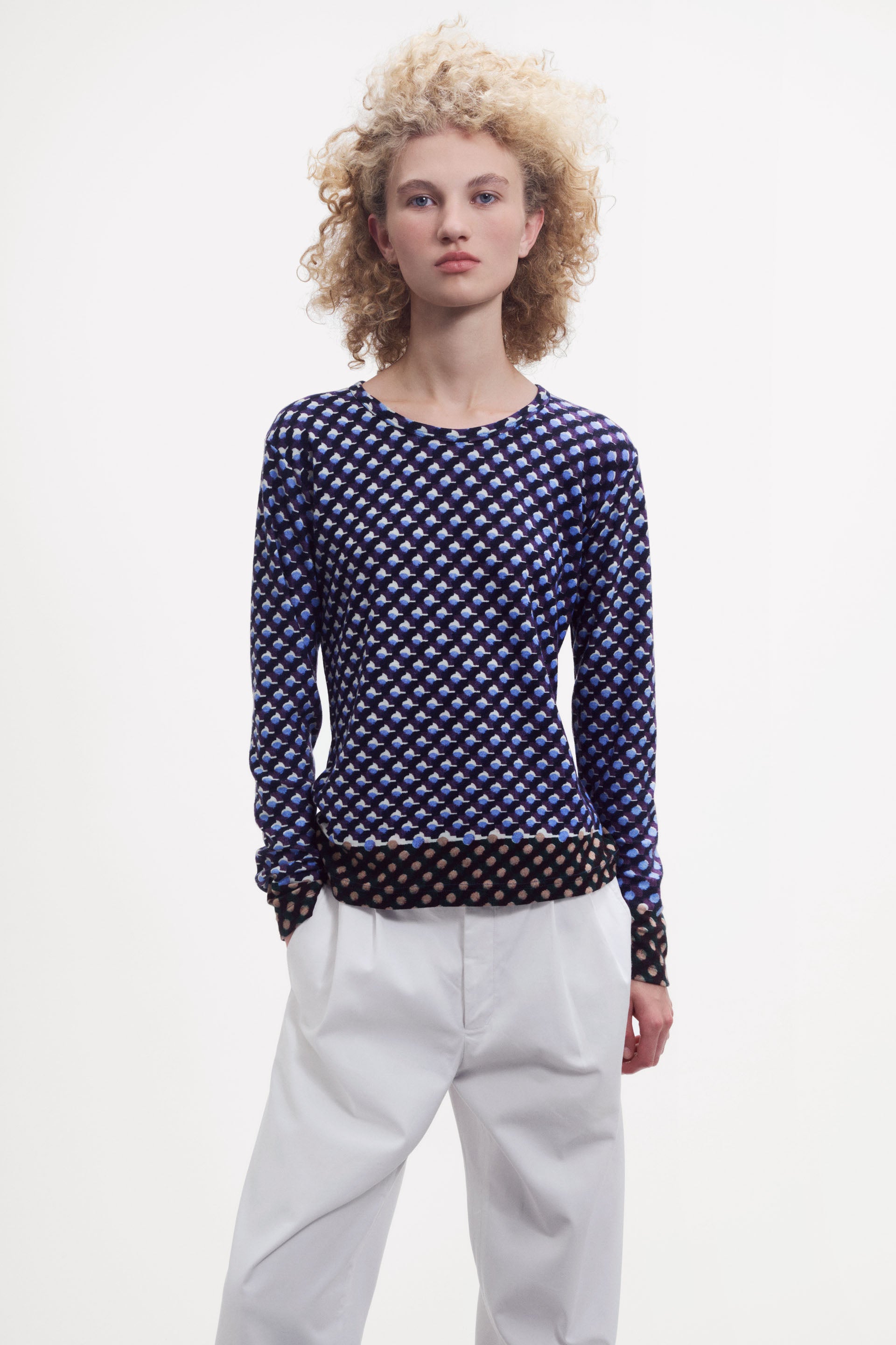 Tee-shirt à manches longues en fine laine mérinos, souple et agréable à porter. Motif Graphique composé de carreaux et pois, animé de subtiles jeux d’optique. Élégante bordure contrastée dans le bas. Modèle élégant, qui peut facilement accompagner nos étoles. Dessin décliné de nos étoles GW 2540. Impression en sérigraphie artisanale, soit 1 cadre pour chaque couleur.