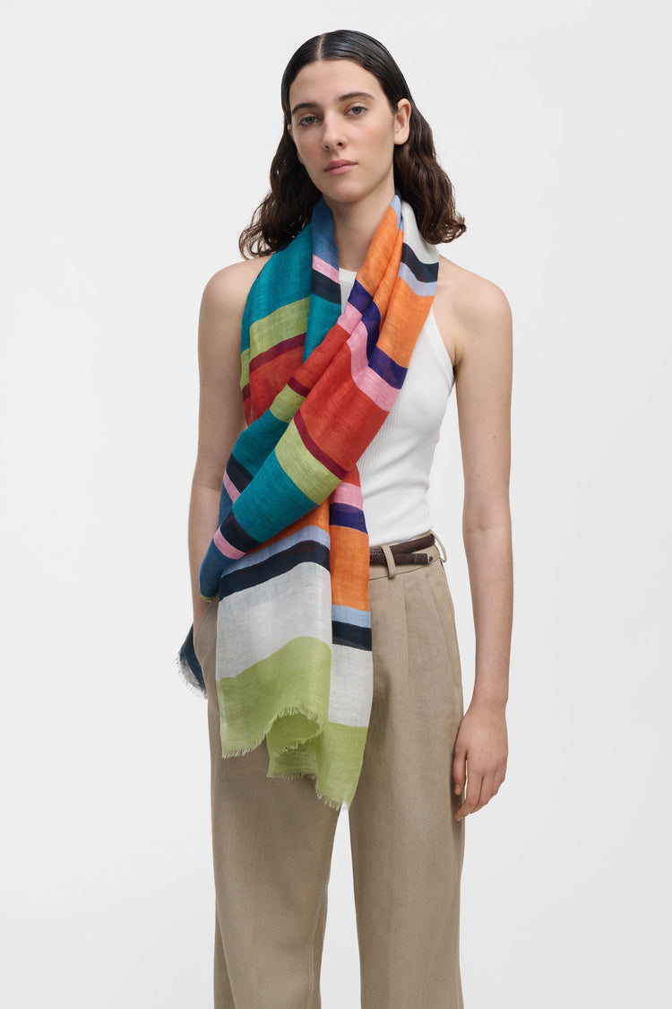 Grande étole tissée main. Tissage fin et très aérien, grâce à la douceur du coton et la souplesse du lin légèrement texturé. Modèle estival, très lumineux, composé de larges et fines rayures aux combinaisons de couleurs vibrantes. Bordure simple, petites franges aux extrémités. Impression en sérigraphie artisanale.