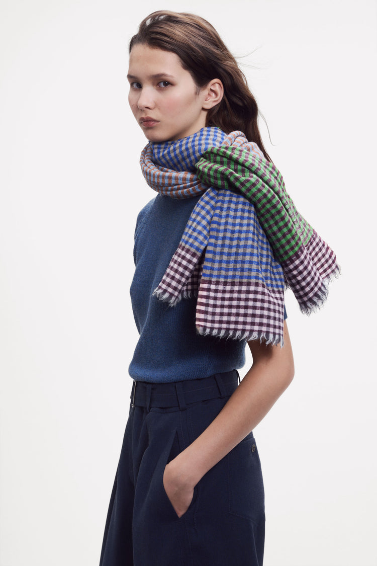 Étole légère au tissage fin et doux. Petits Carreaux déclinés de notre modèle classique Check 4. Étole très lumineuse composée de cinq panneaux, tissée avec de nouvelles combinaisons de couleurs. Les effets multicolores se révèlent au nouage par les jeux de superpositions. Dessin original, tissé avec des fils teints. Finition petites franges fines.